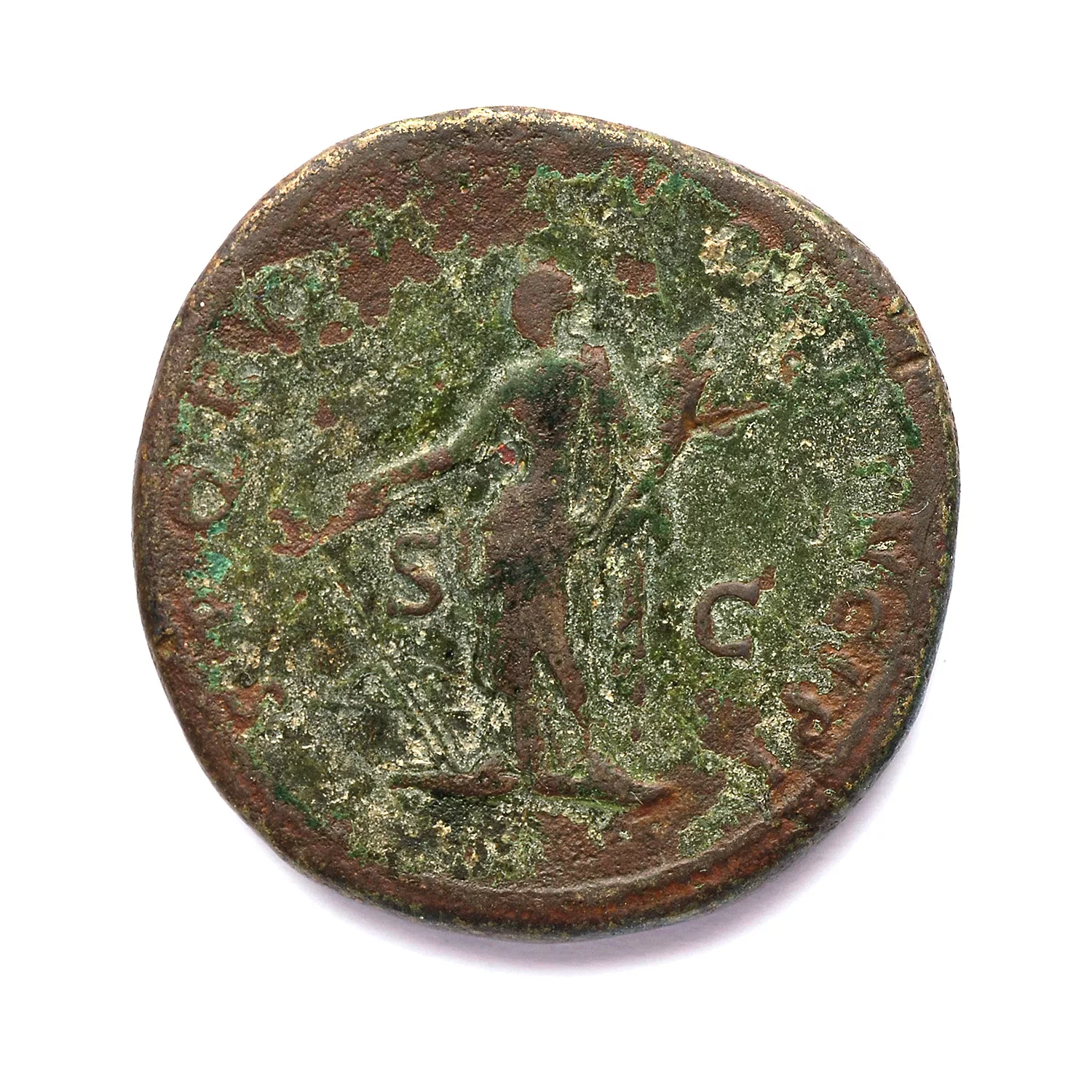 Fortuna debout à gauche tenant un gouvernail et une corne d'abondance ; derrière, proue