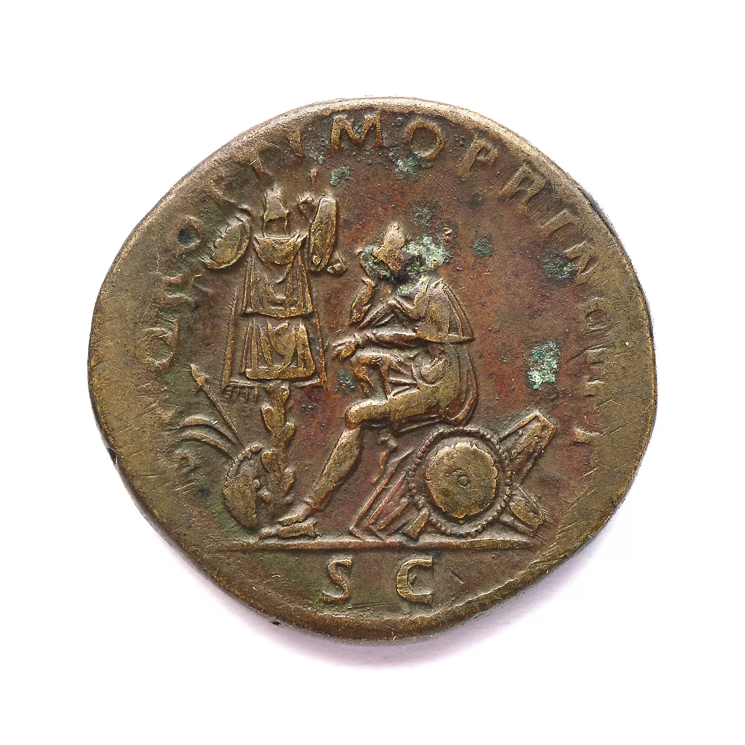 La Dacie assise à gauche sur une pile d'armes, devant un trophée
