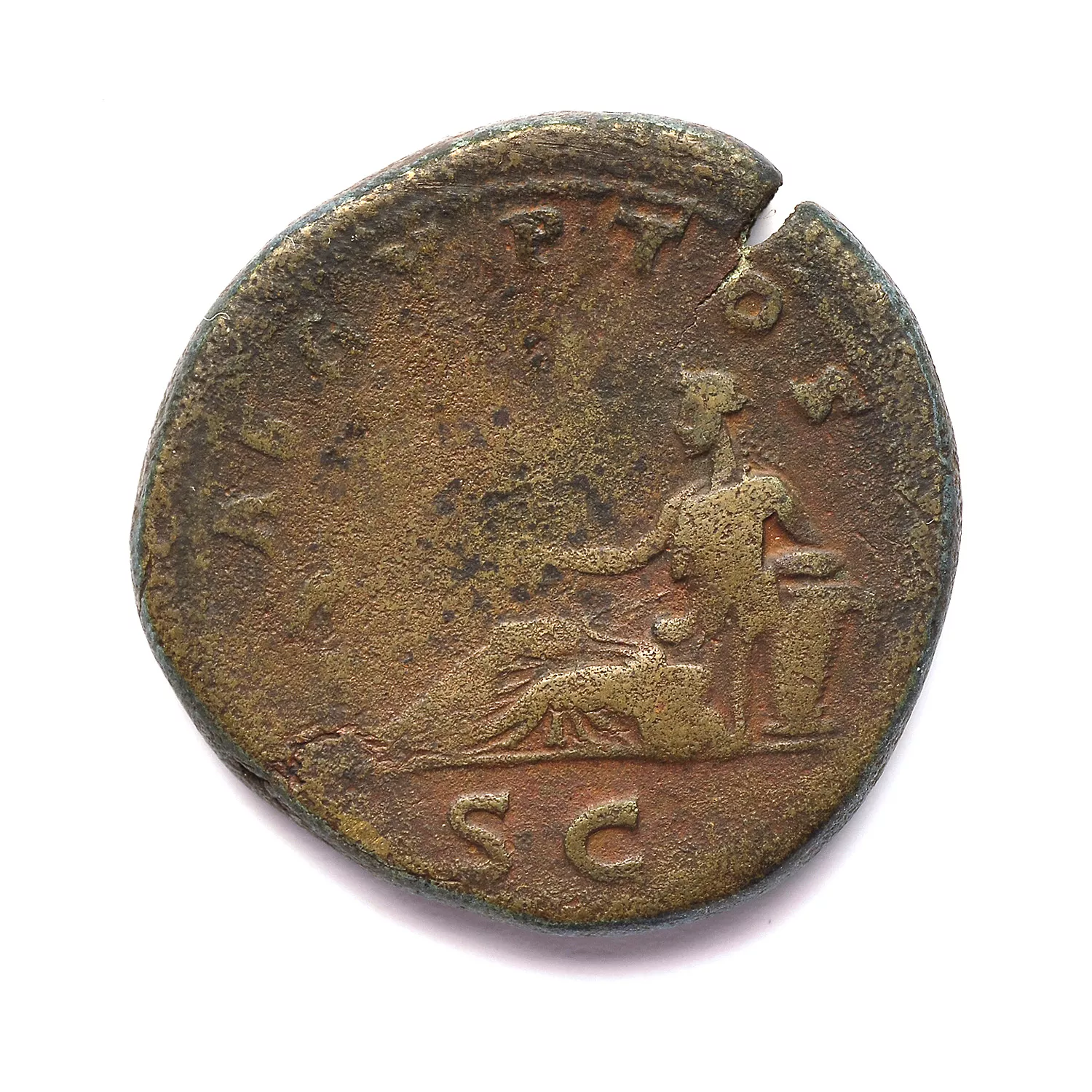 L'Egypte allongée à gauche, tenant un sistre, son épaule gauche reposant sur un panier de grain ; ibis sur une colonne devant elle