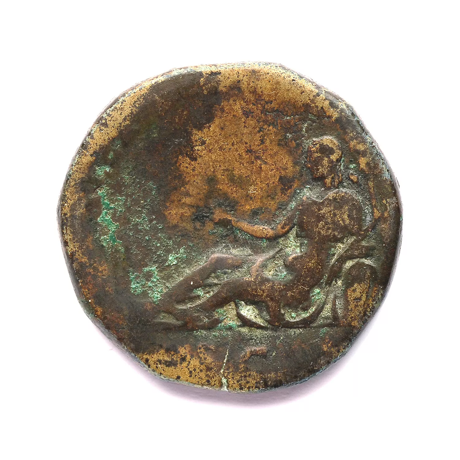 Alexandrie allongée à gauche, tenant trois épis et une branche de vigne, son bras appuyé sur un panier rempli d'épis