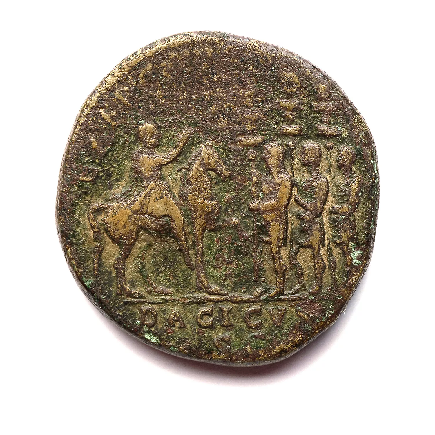 Hadrien à cheval à droite, haranguant trois soldats, tenant un aigle légionnaire et deux enseignes