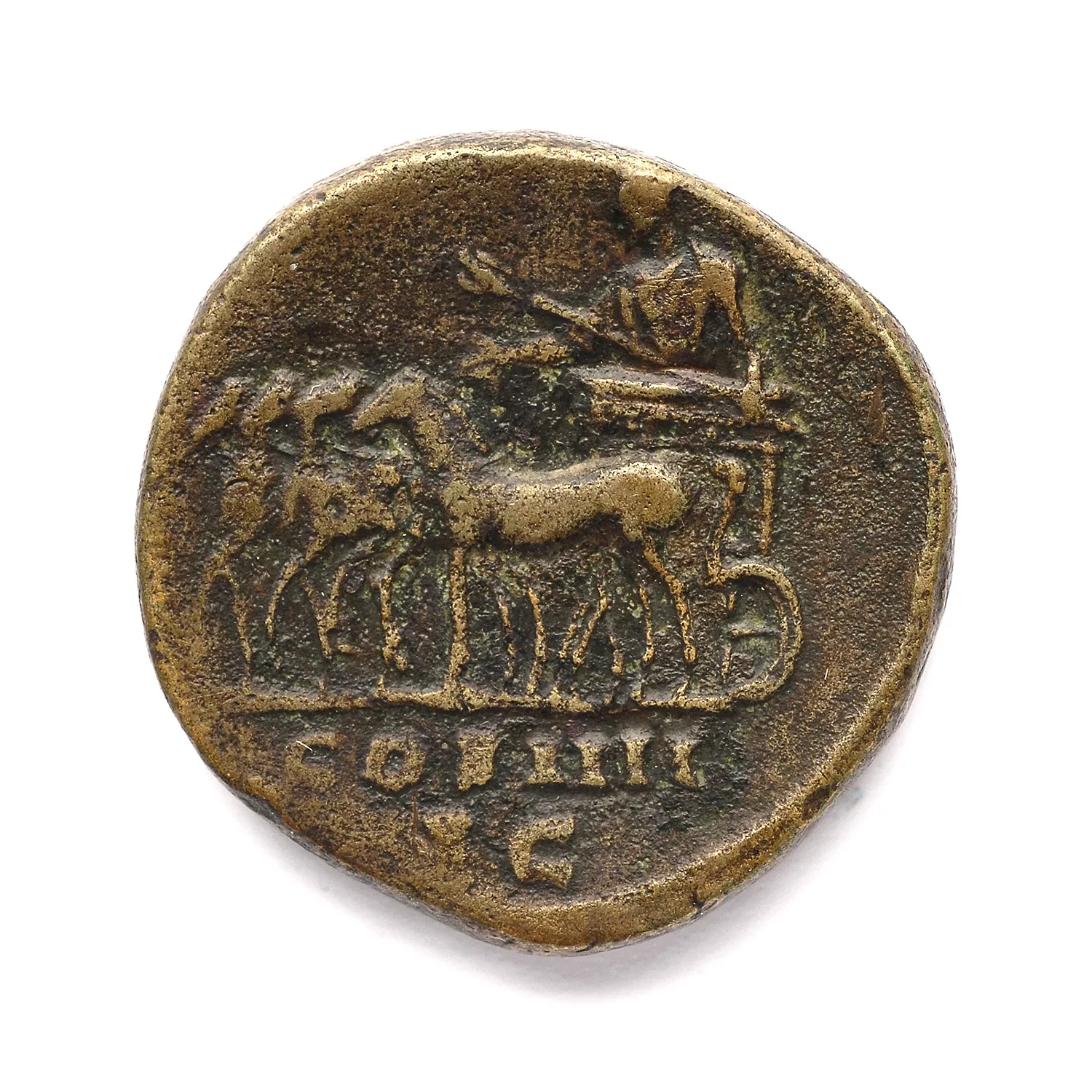 Antonin dans un quadrige à gauche, tenant un sceptre surmonté d'un aigle