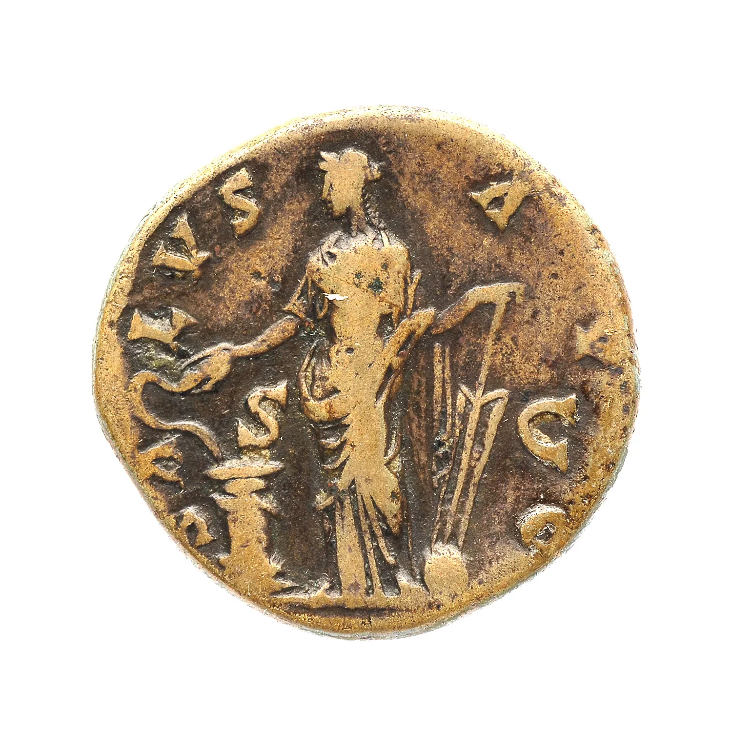Salus debout à gauche, nourrissant un serpent enroulé autour d'un autel et tenant un gouvernail sur un globe