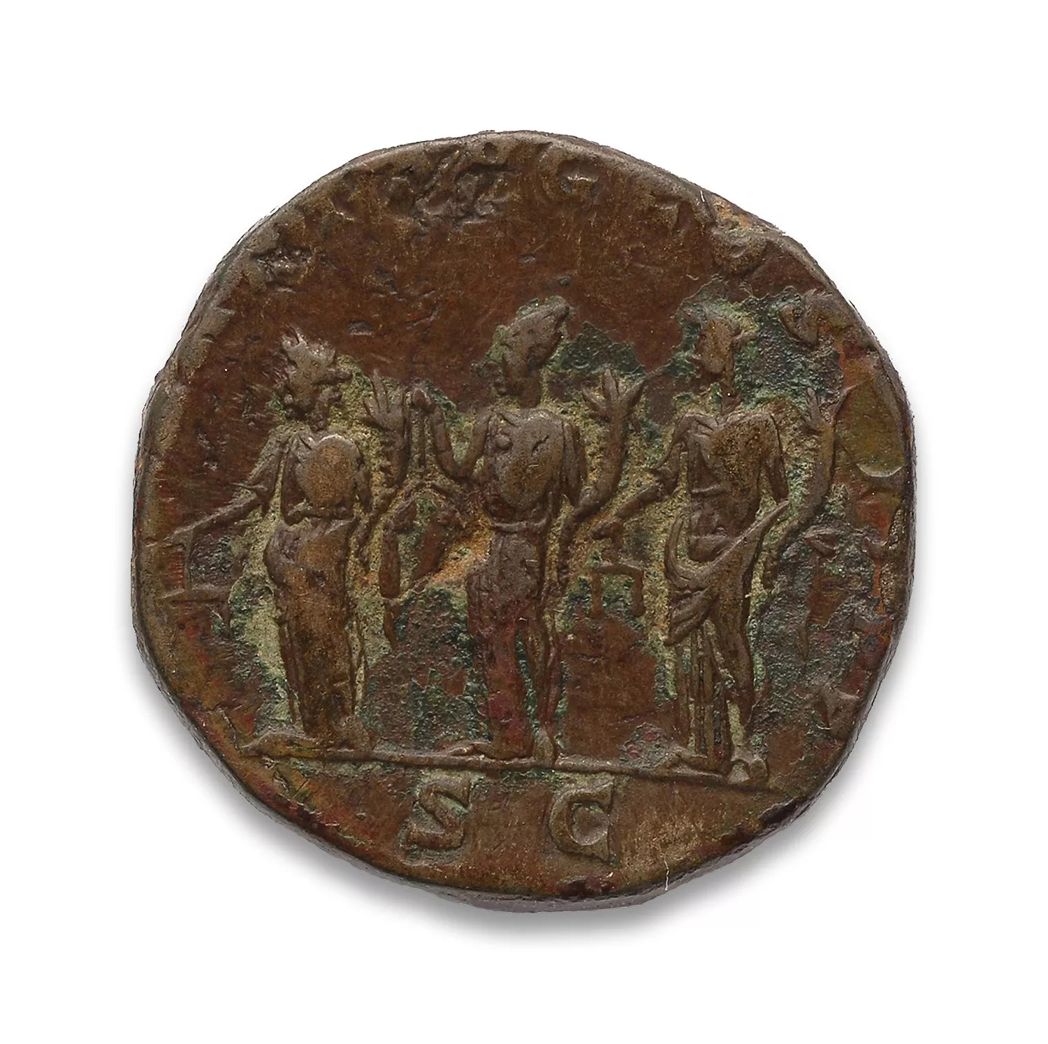 Les trois Monetae debout à gauche, tenant chacune une balance et une corne d'abondance