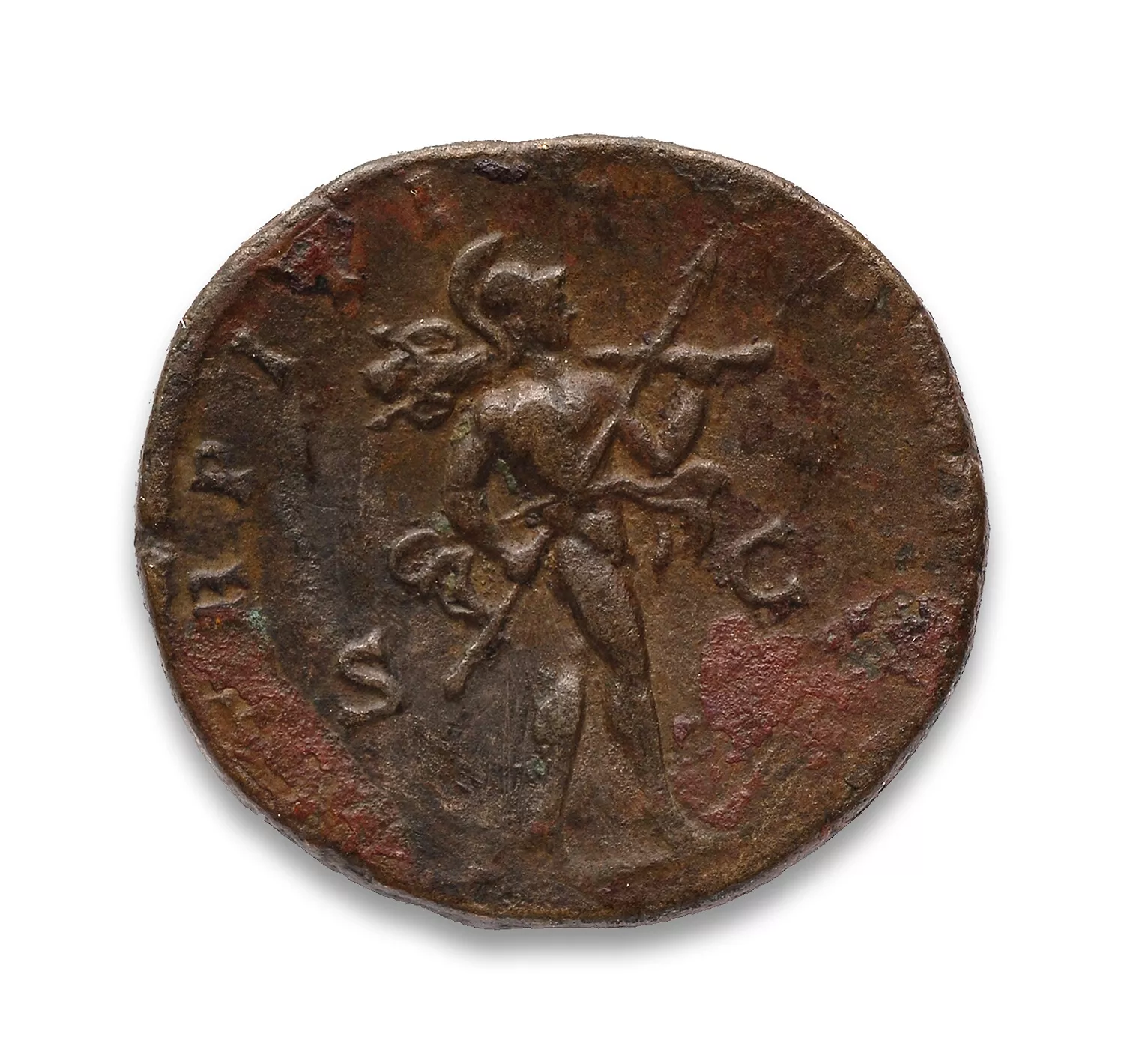 Mars avançant à droite, portant une lance et un trophée