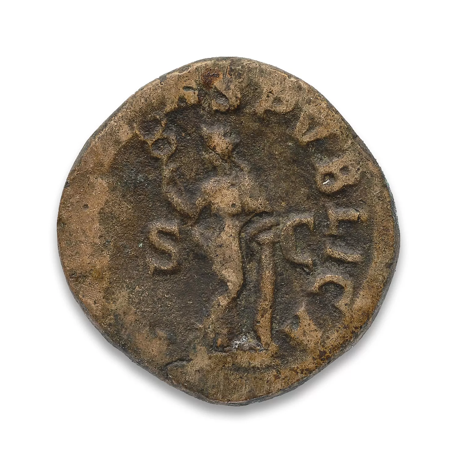 Felicitas debout de face, tête à gauche, jambes croisées, appuyée contre une colonne, tenant un caducée
