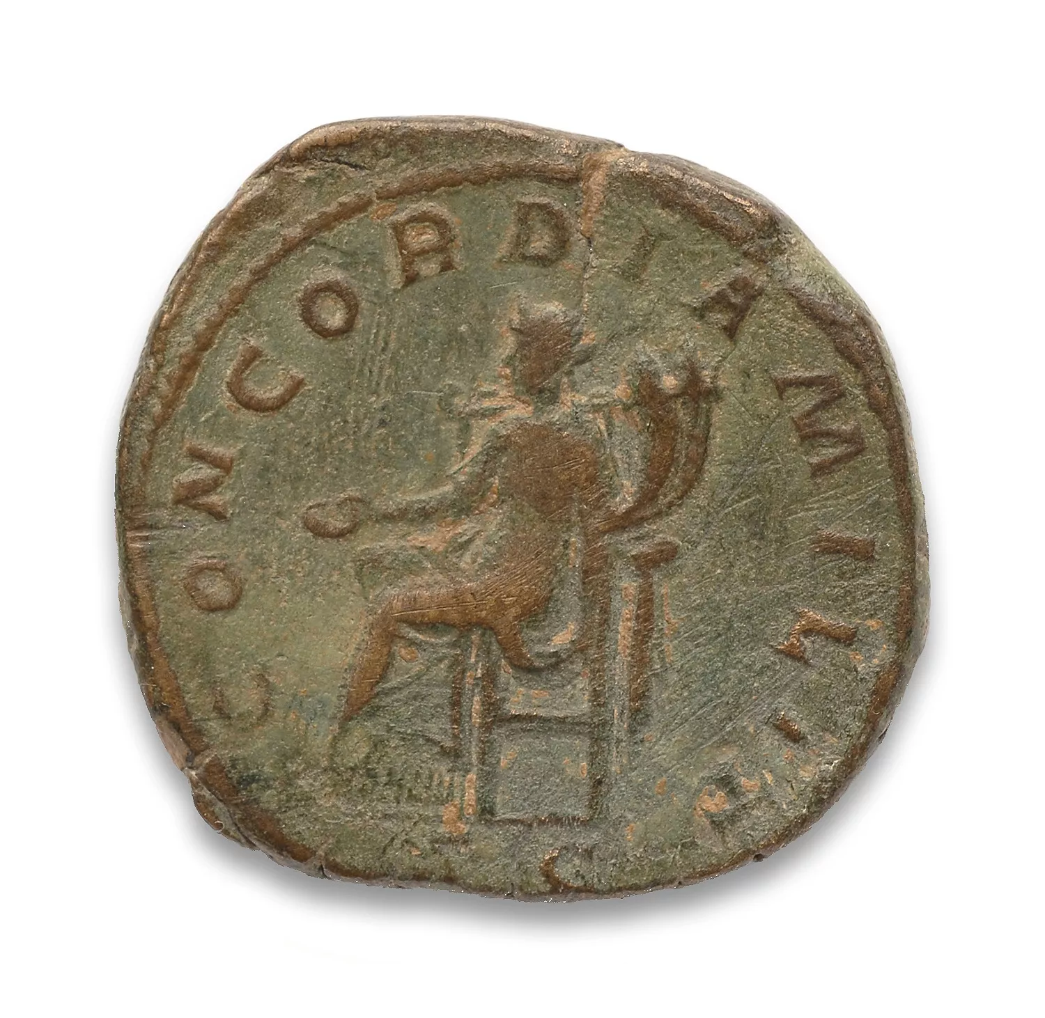 Concordia assise à gauche, tenant une patère et une double corne d'abondance