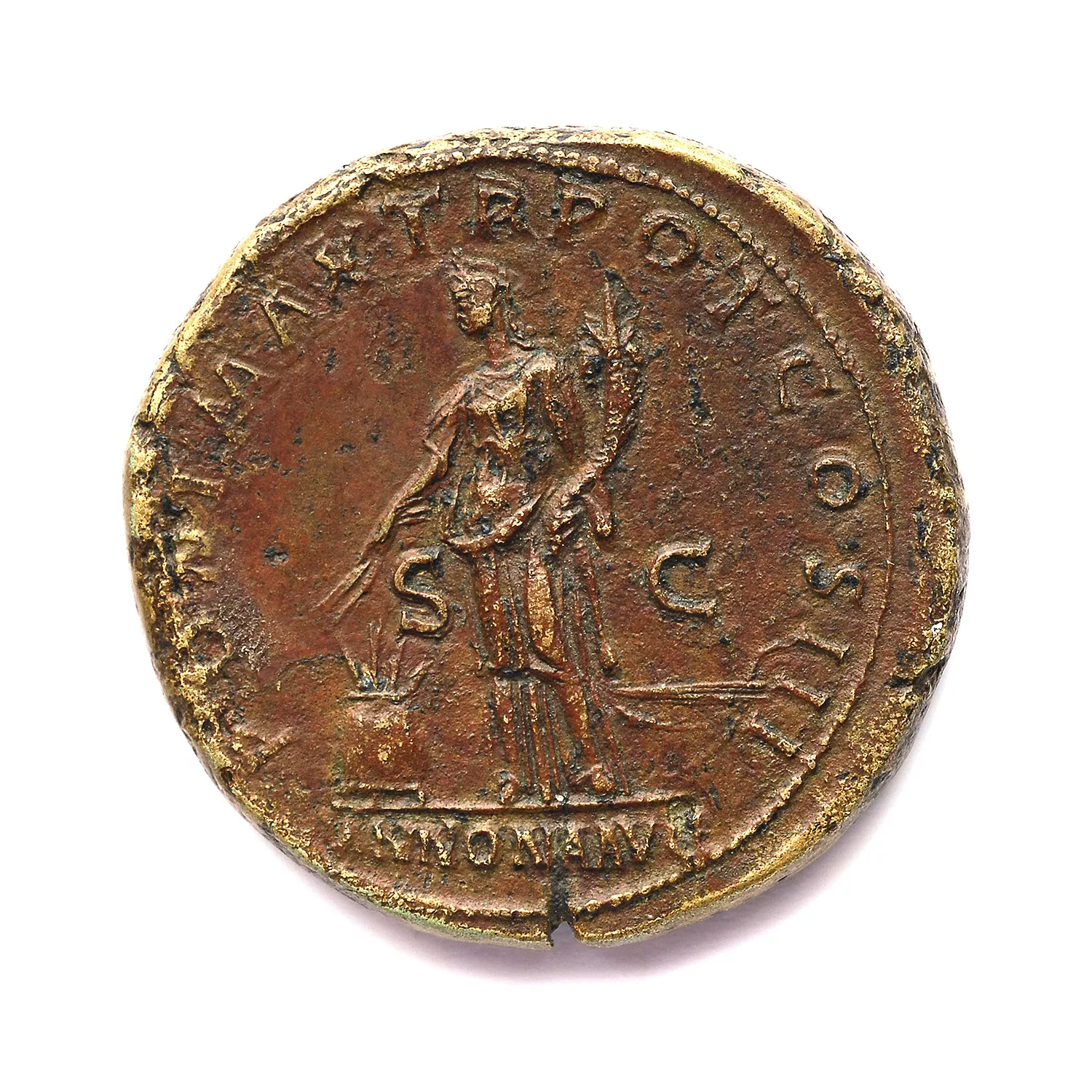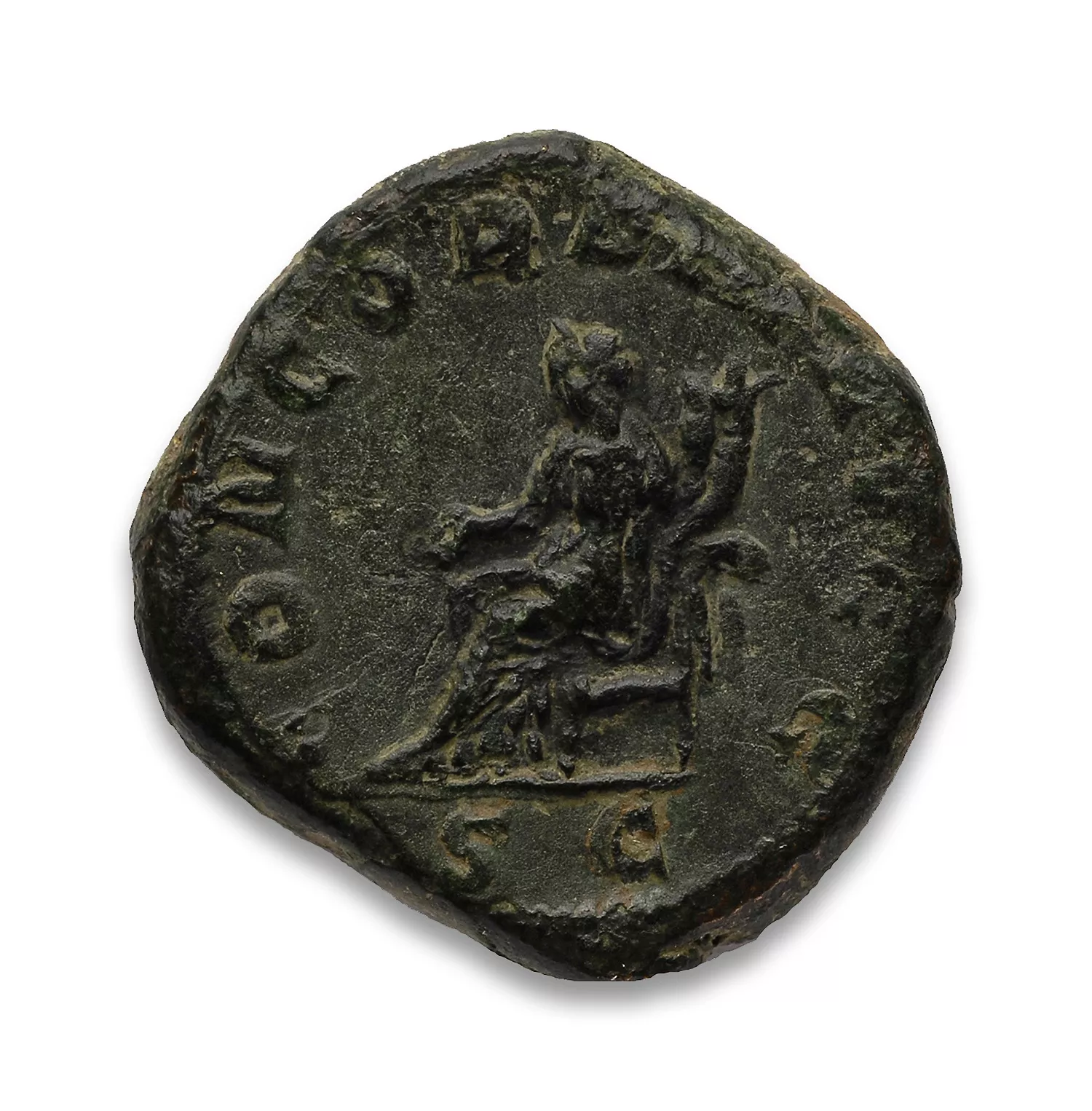Concordia assise à gauche, tenant une patère et une double corne d'abondance