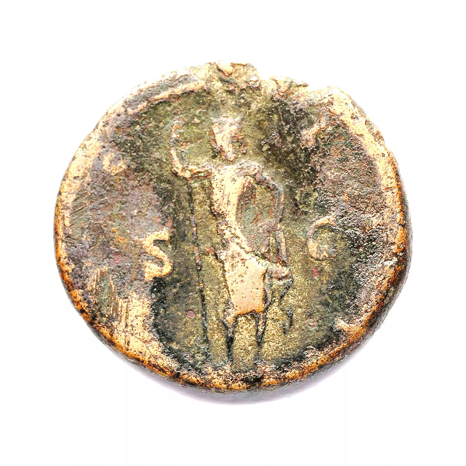 Janus debout de front, tenant un sceptre, main gauche sur la hanche
