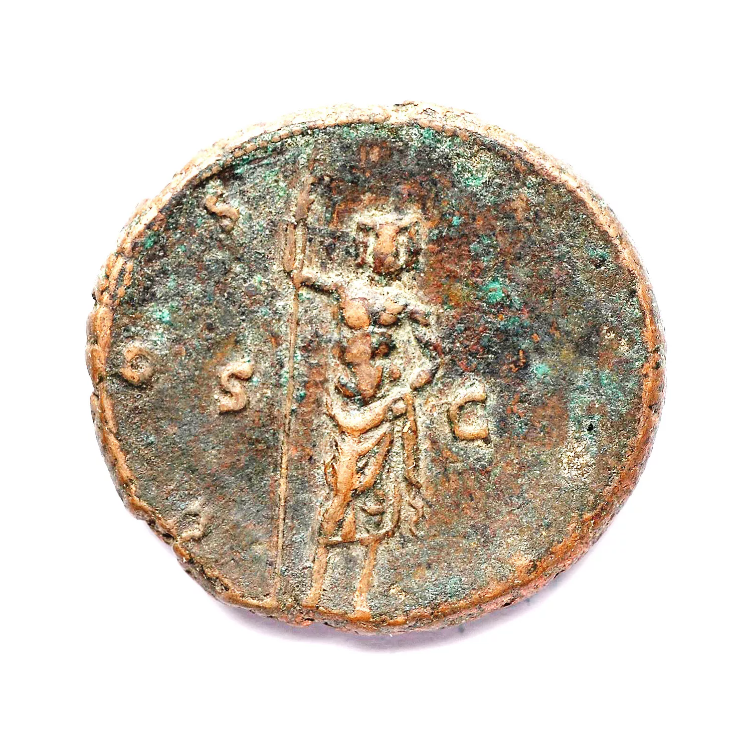 Janus debout de front, tenant un sceptre, main gauche sur la hanche