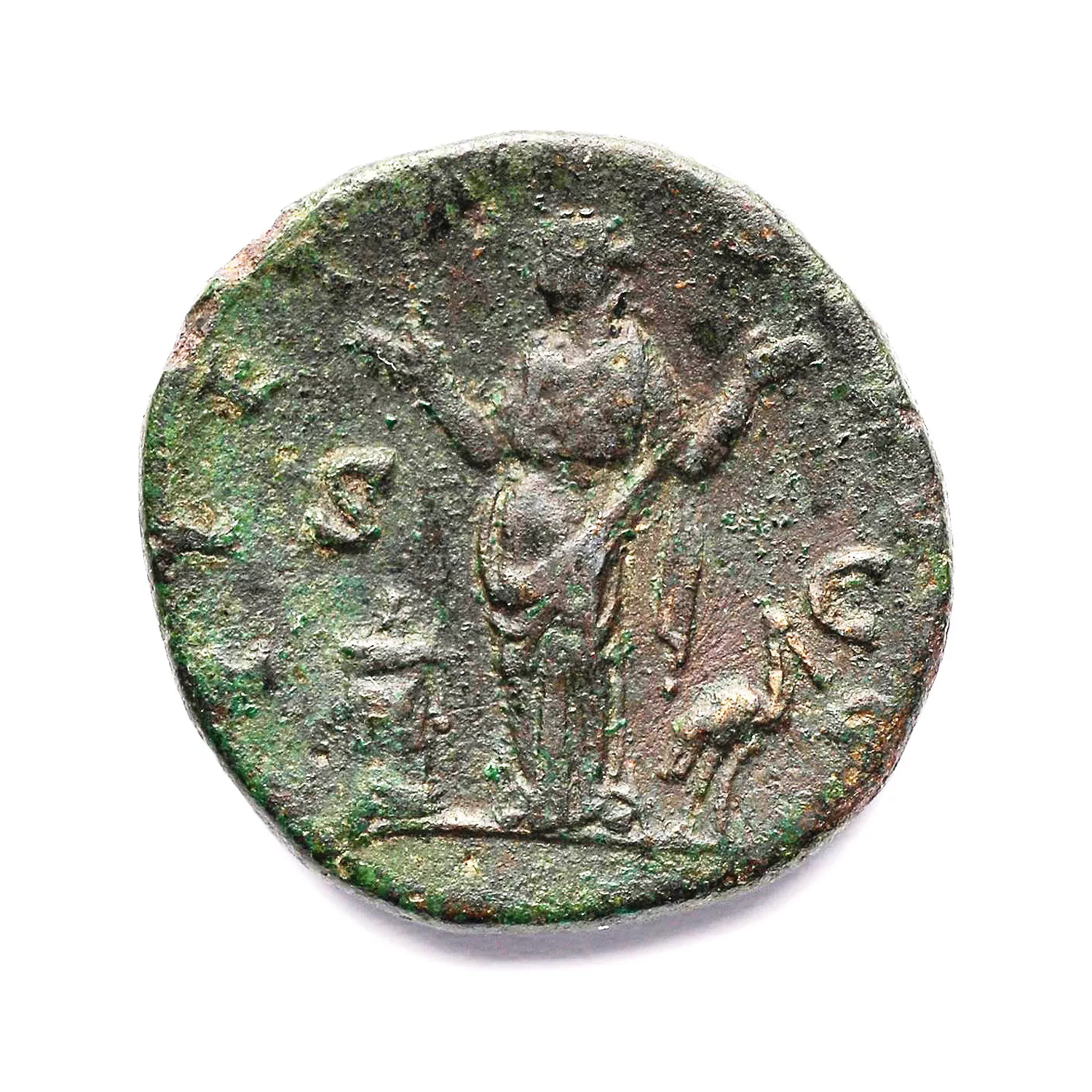 Pietas debout de face, priant les deux mains levées ; à gauche,autel, à droite une cicogne