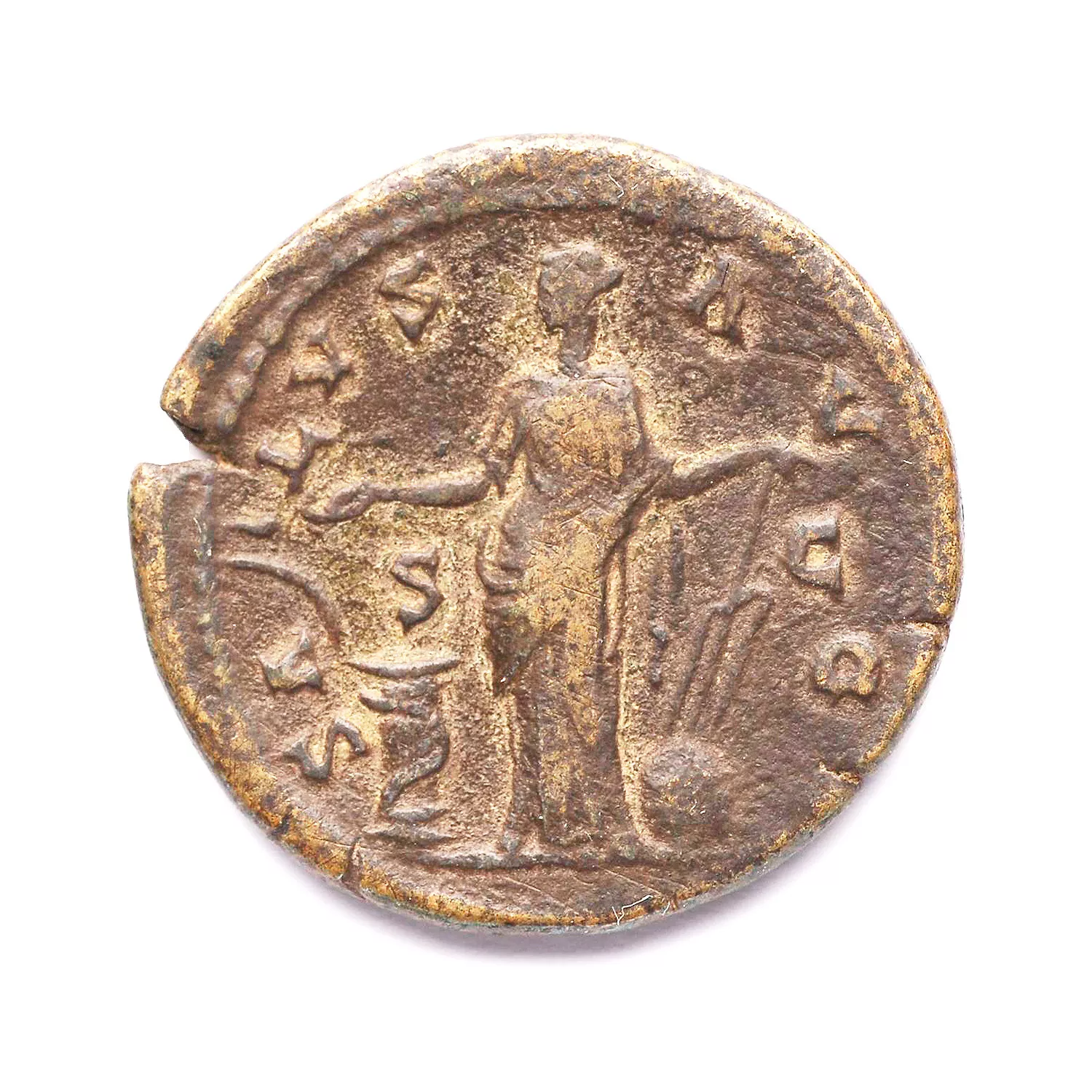 Salus debout de face, tête à gauche, nourrissant un serpent enroulé autour d'un autel et tenant un gouvernail sur un globe