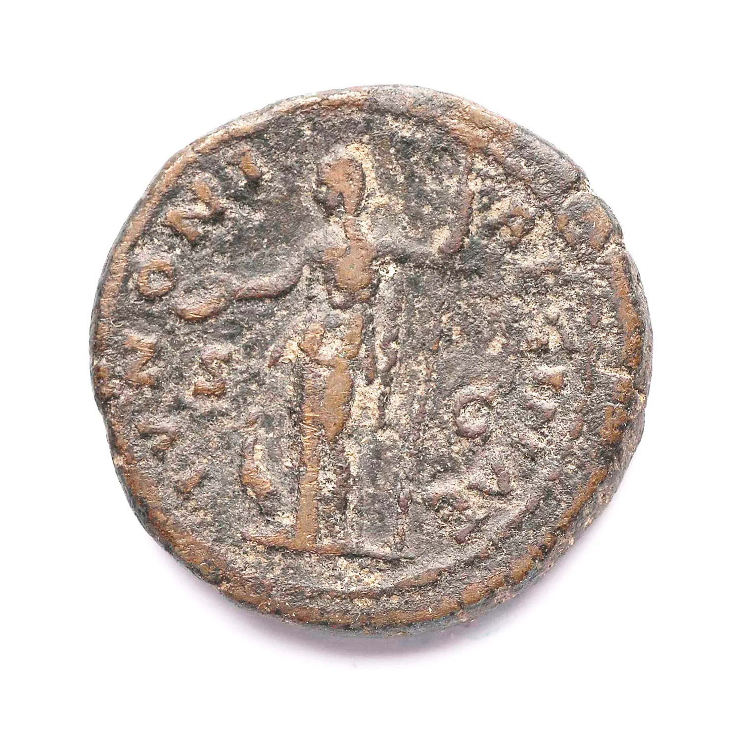 Junon debout à gauche, tenant une patère et un long sceptre ; devant, un paon