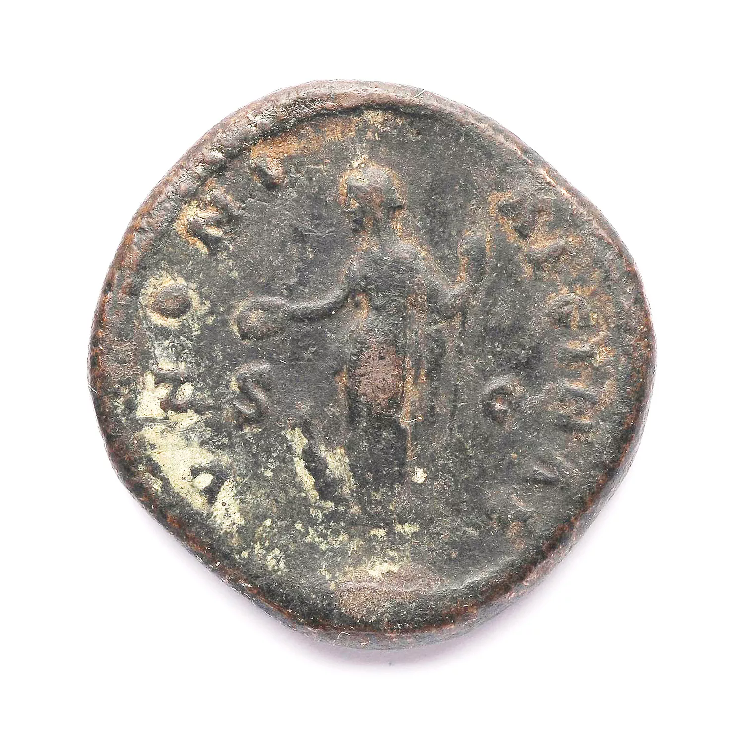 Junon debout à gauche, tenant une patère et un long sceptre ; devant un paon