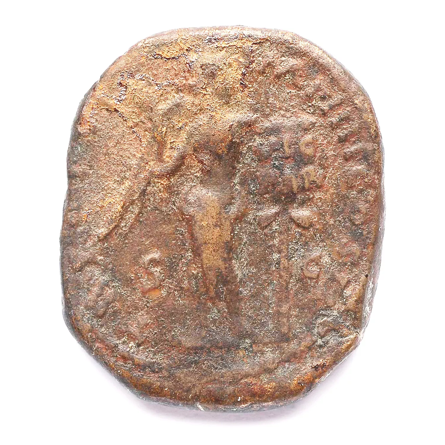 Victoire debout de face, tête à gauche, tenant une palme et fixant sur le tronc d'un palmier un bouclier inscrit VIC/PAR