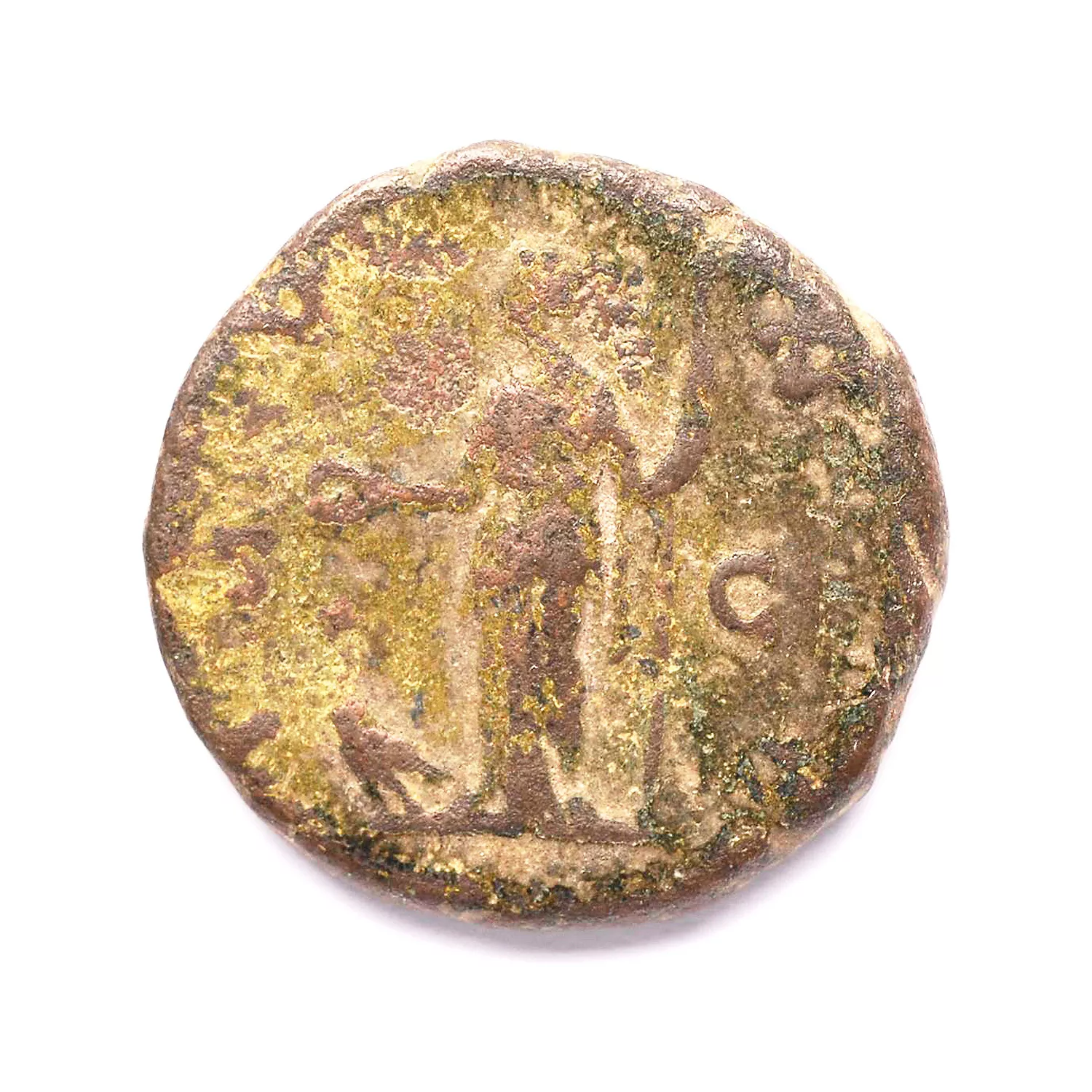 Junon debout à gauche, tenant une patère et un long sceptre droit ; devant elle, un paon