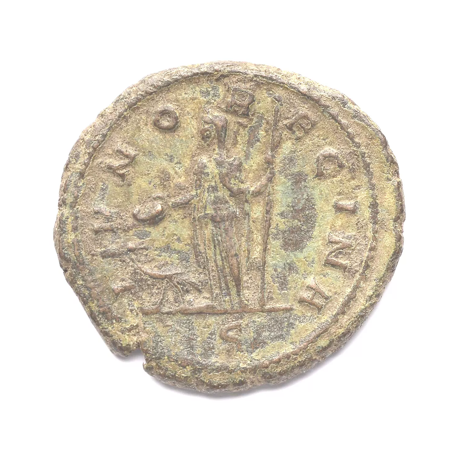 Junon debout à gauche, tenant une patère et un long sceptre droit ; devant elle, un paon