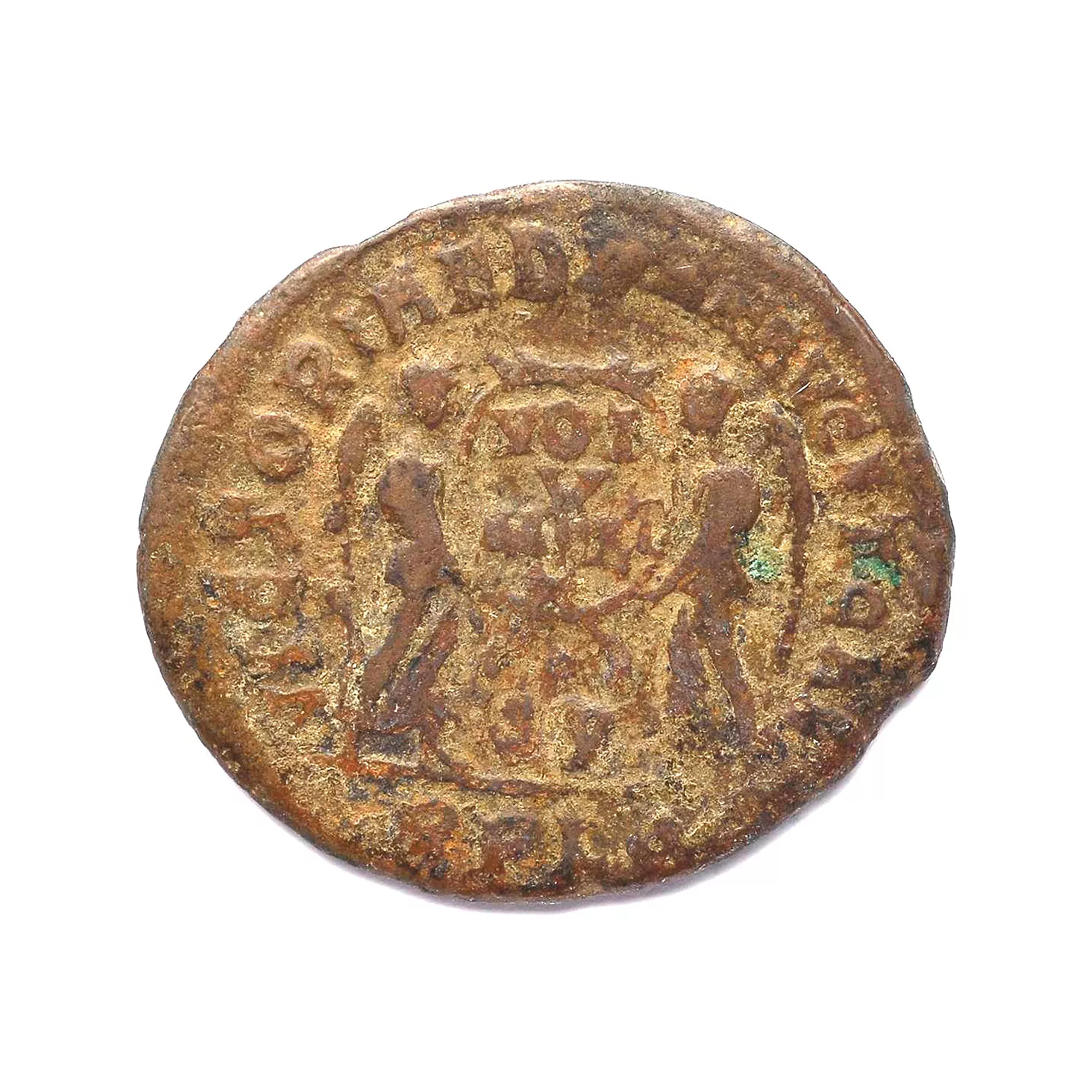 Deux victoires tenant une couronne inscrite VOT/V/MVLT/X