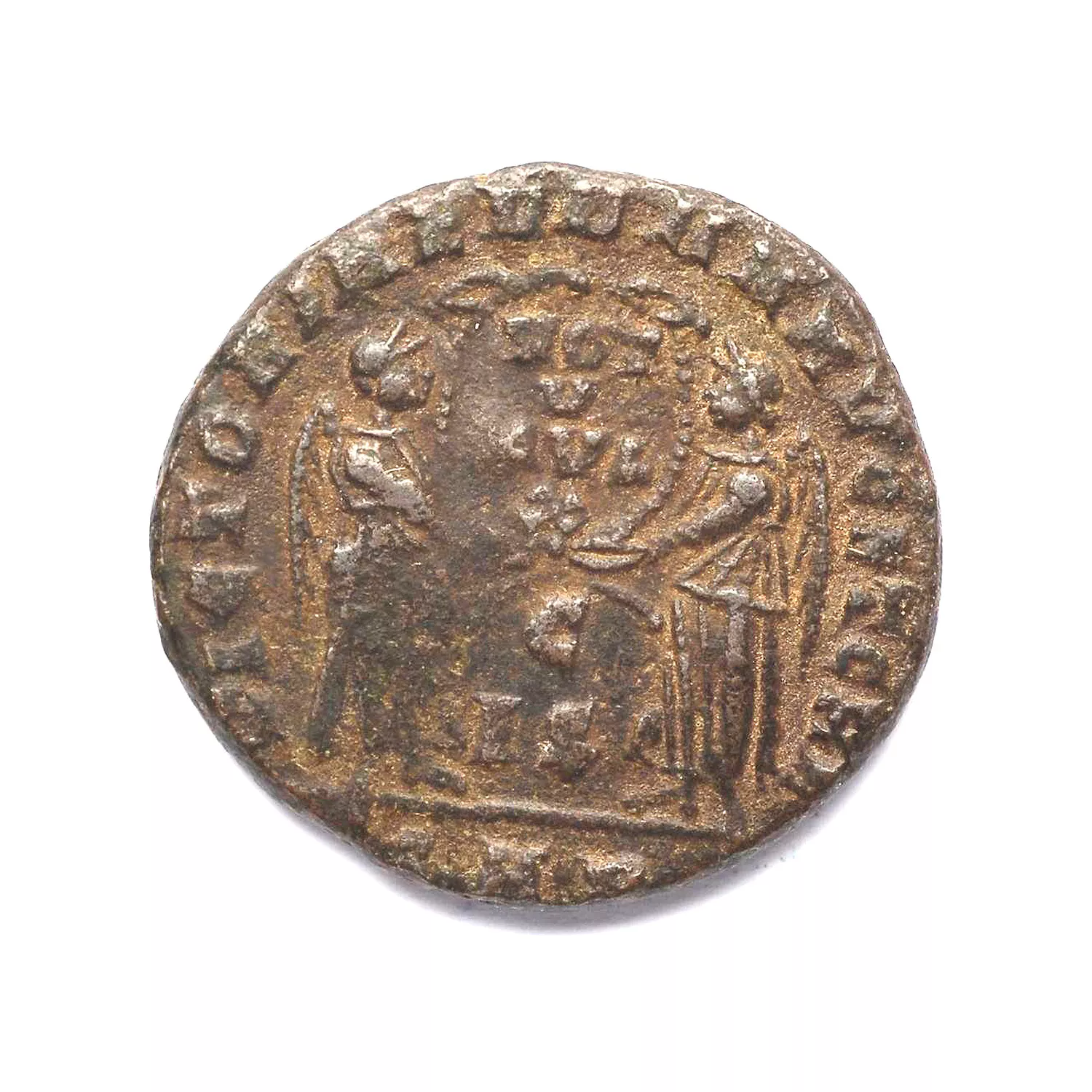 Deux victoires tenant une couronne inscrite VOT/V/MVL/X