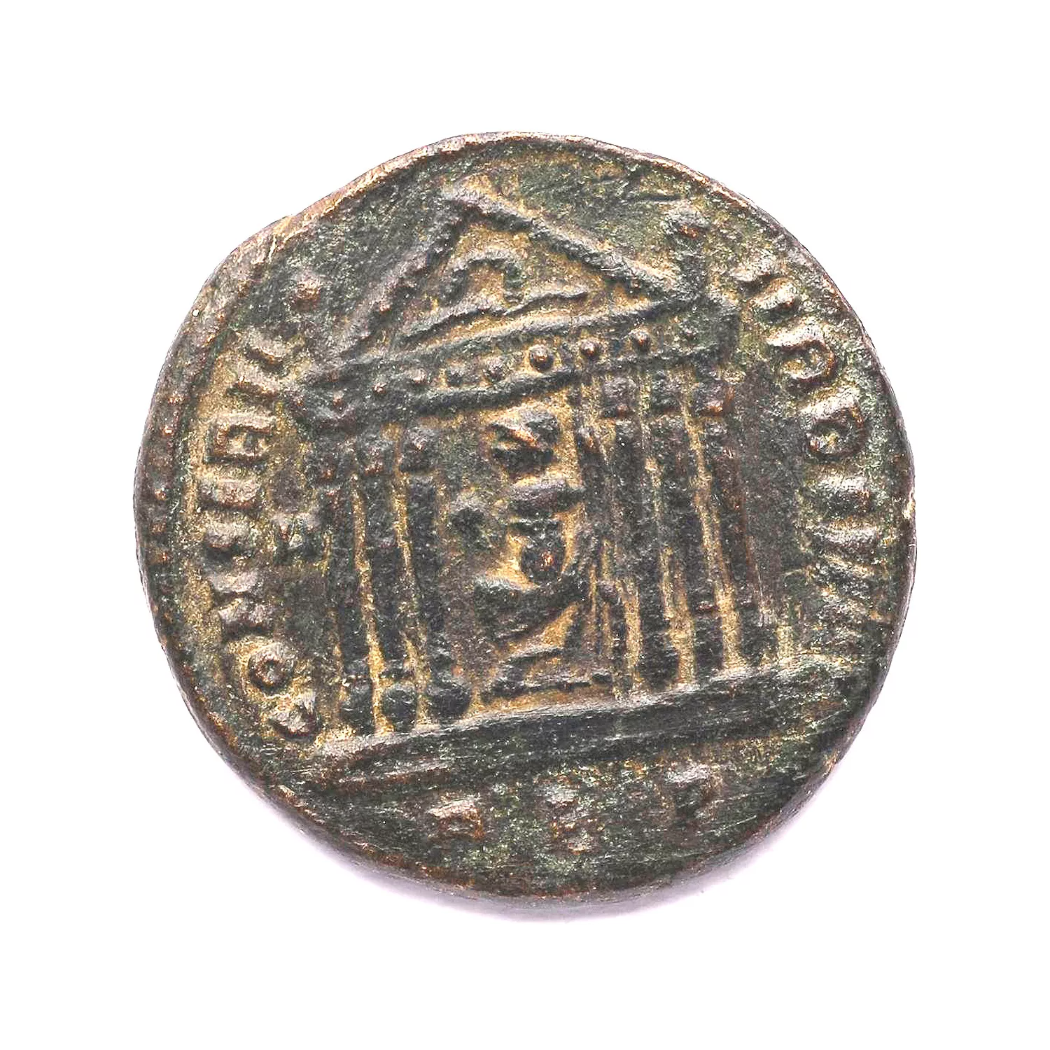 Roma assise de face, tête à gauche, dans un temple hexastyle avec une couronne dans le fronton, tenant un globe et une lance