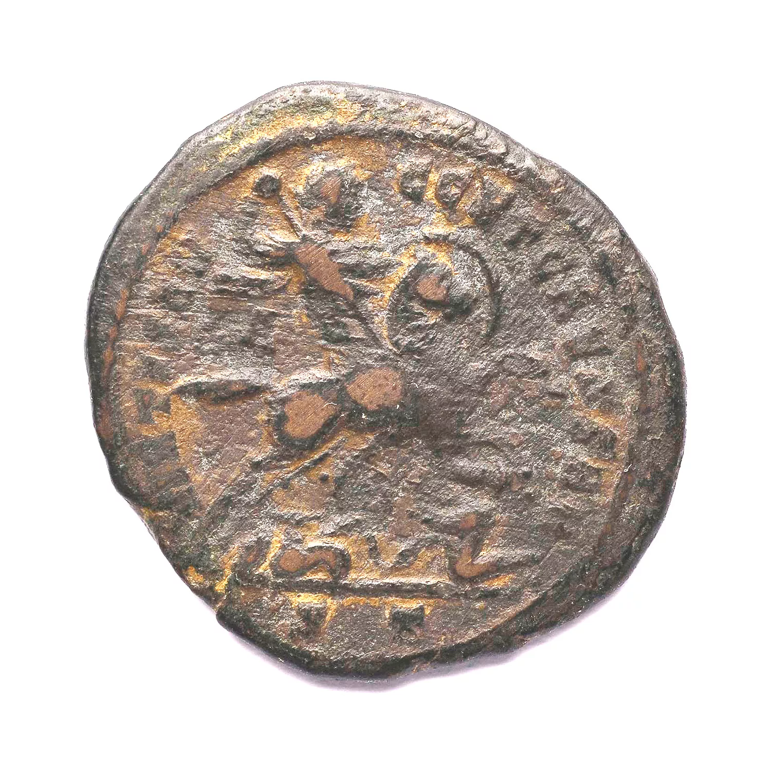 L'empereur galoppant à droite, tenant un bouclier et une lance, soumettant deux ennemis à terre