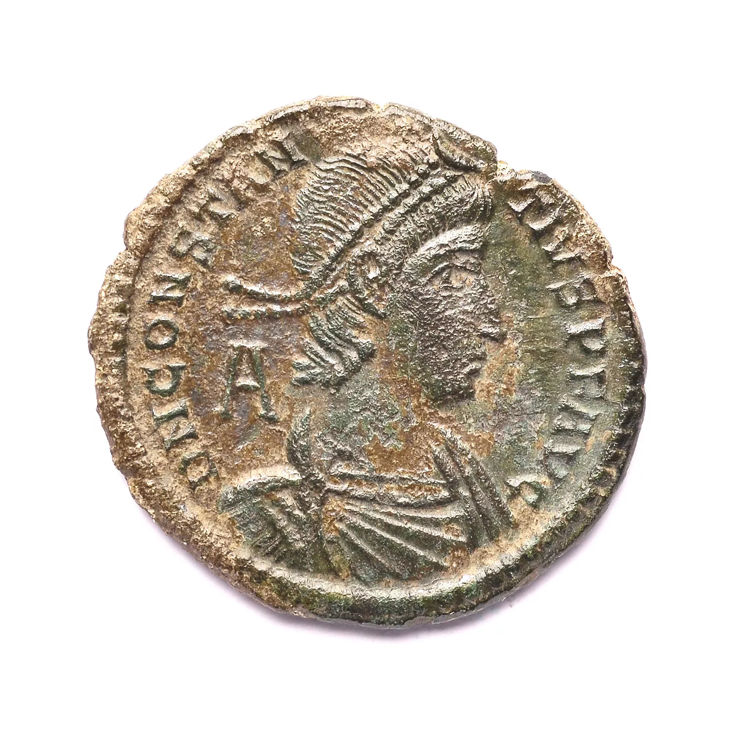 Buste diadémé, drapé et cuirassé de Constance II à droite, A derrière le buste