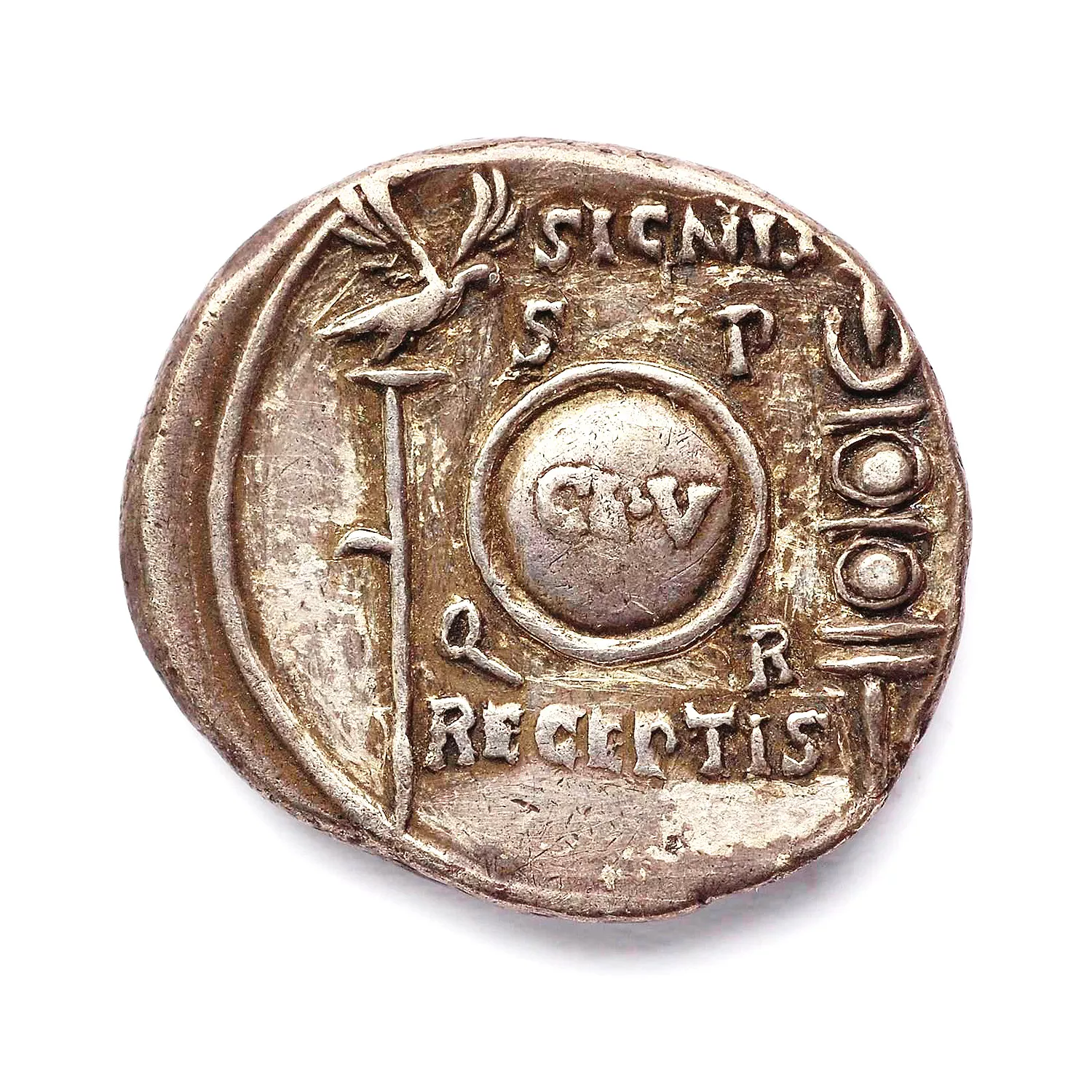 A gauche, aquila ; à droite, enseigne ; au centre bouclier inscrit CL V et entouré des lettres SPQR