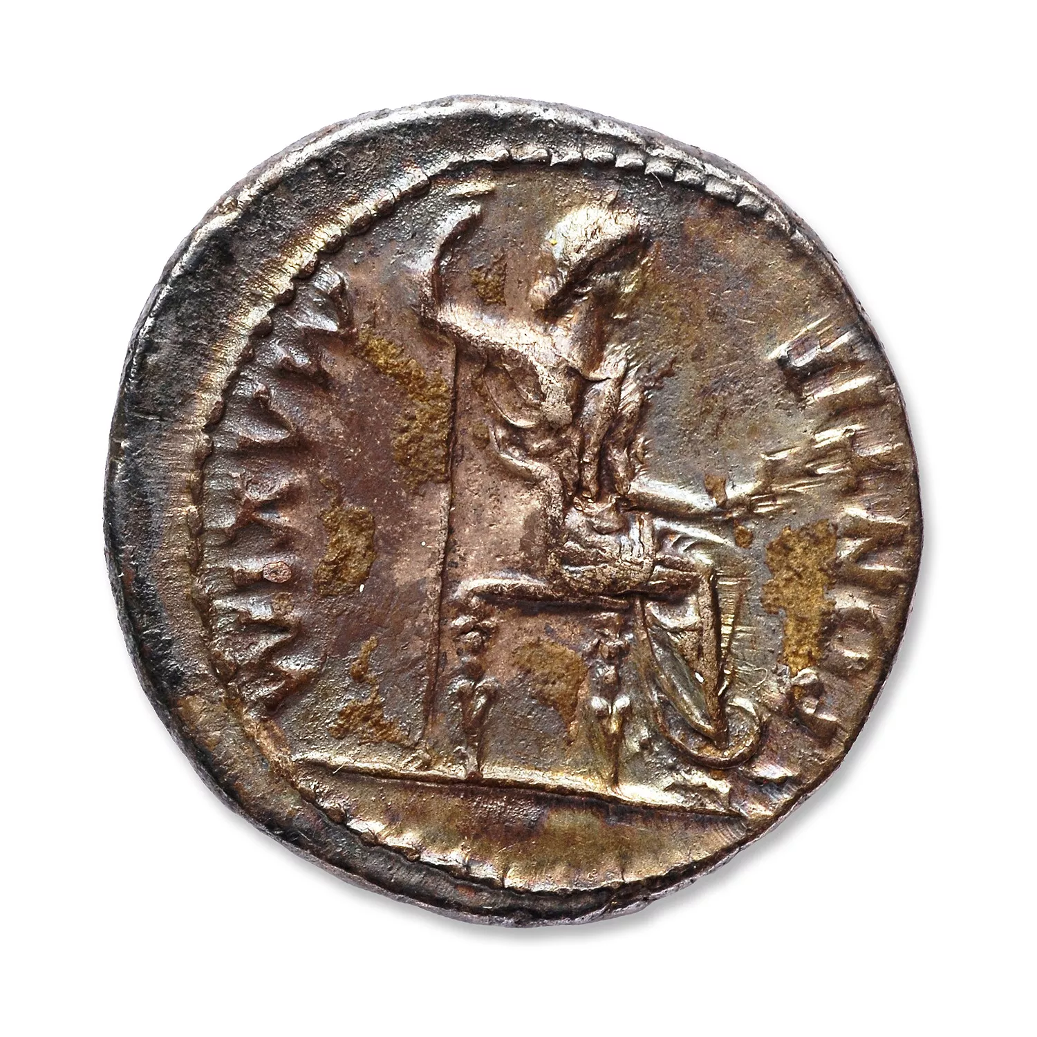 Femme assise à droite, tenant un sceptre vertical et un rameau ; une seule ligne de sol