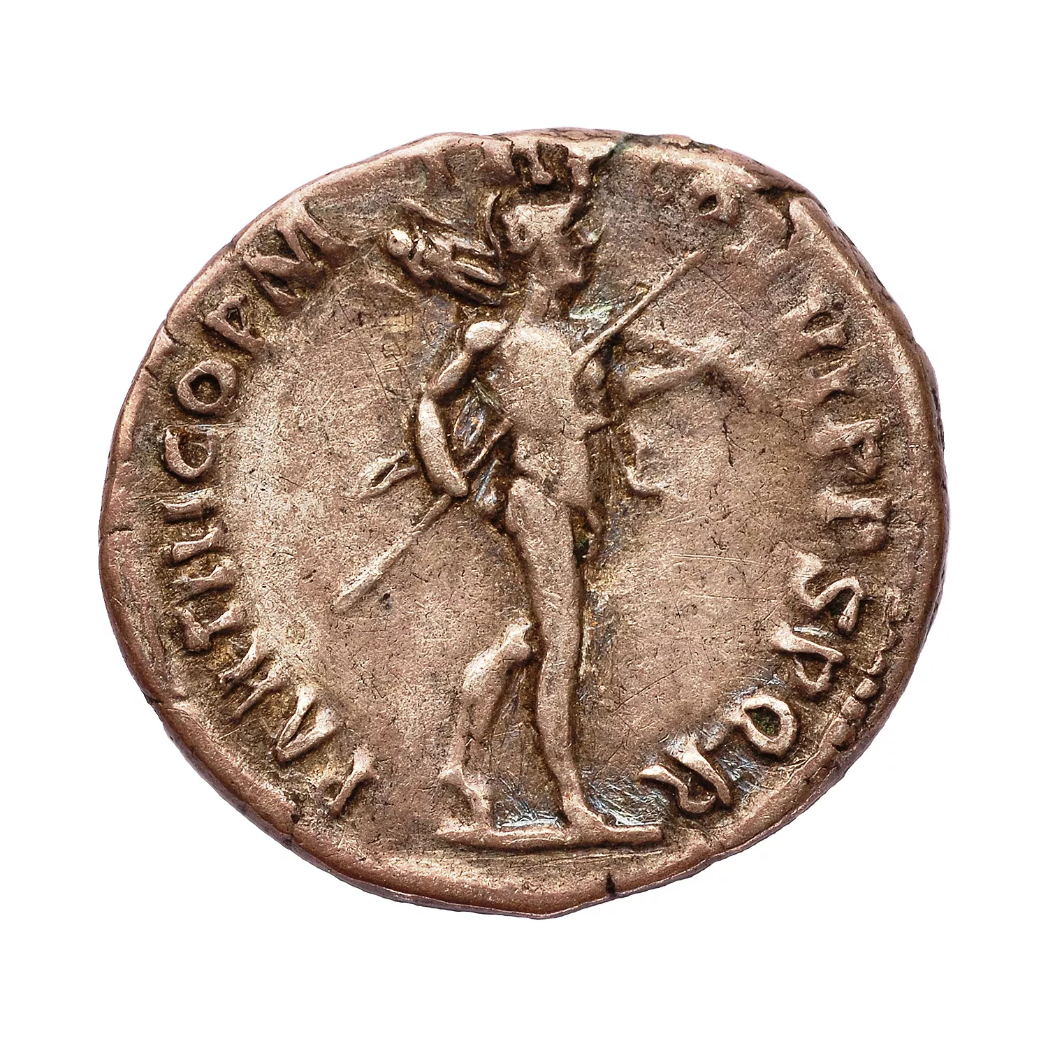 Mars avançant à droite, tenant un trophée sur l'épaule et une lance, pointe vers le haut
