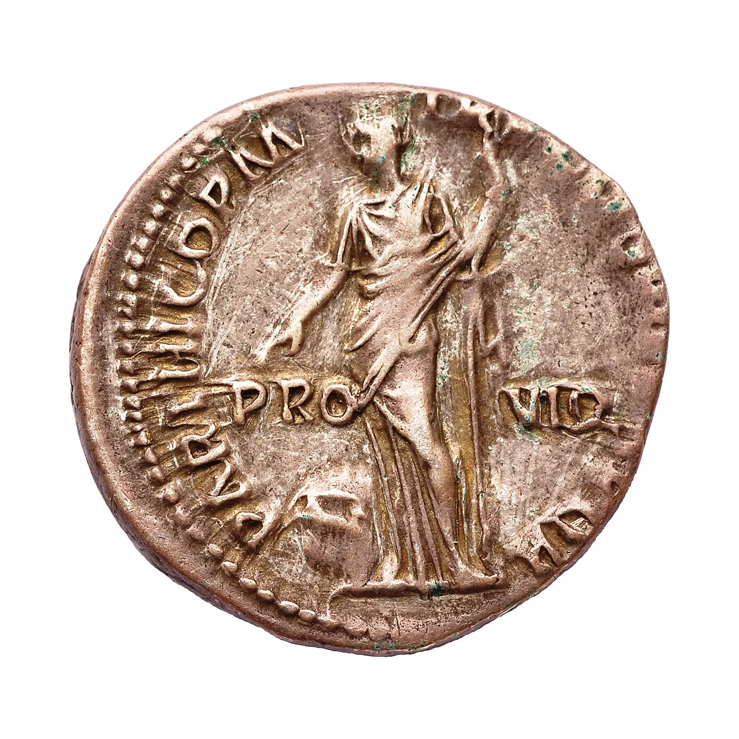 Providentia debout à gauche, pointant un objet à ses pieds (globe ?) et tenant un long sceptre vertical