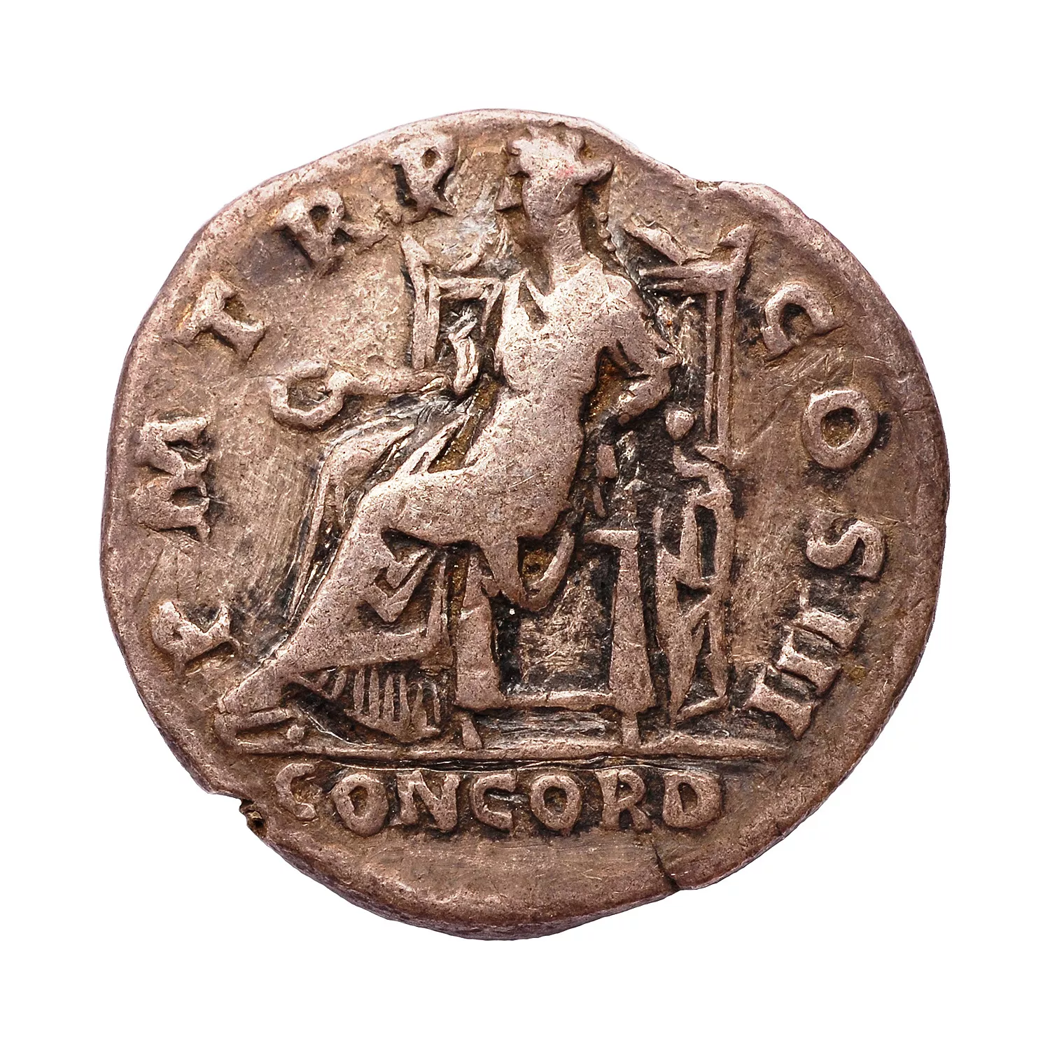 Concordia assise à gauche, tenant une patère ; son épaule appuyée contre une statue de Spes ; pas de corne d'abondance sous le siège