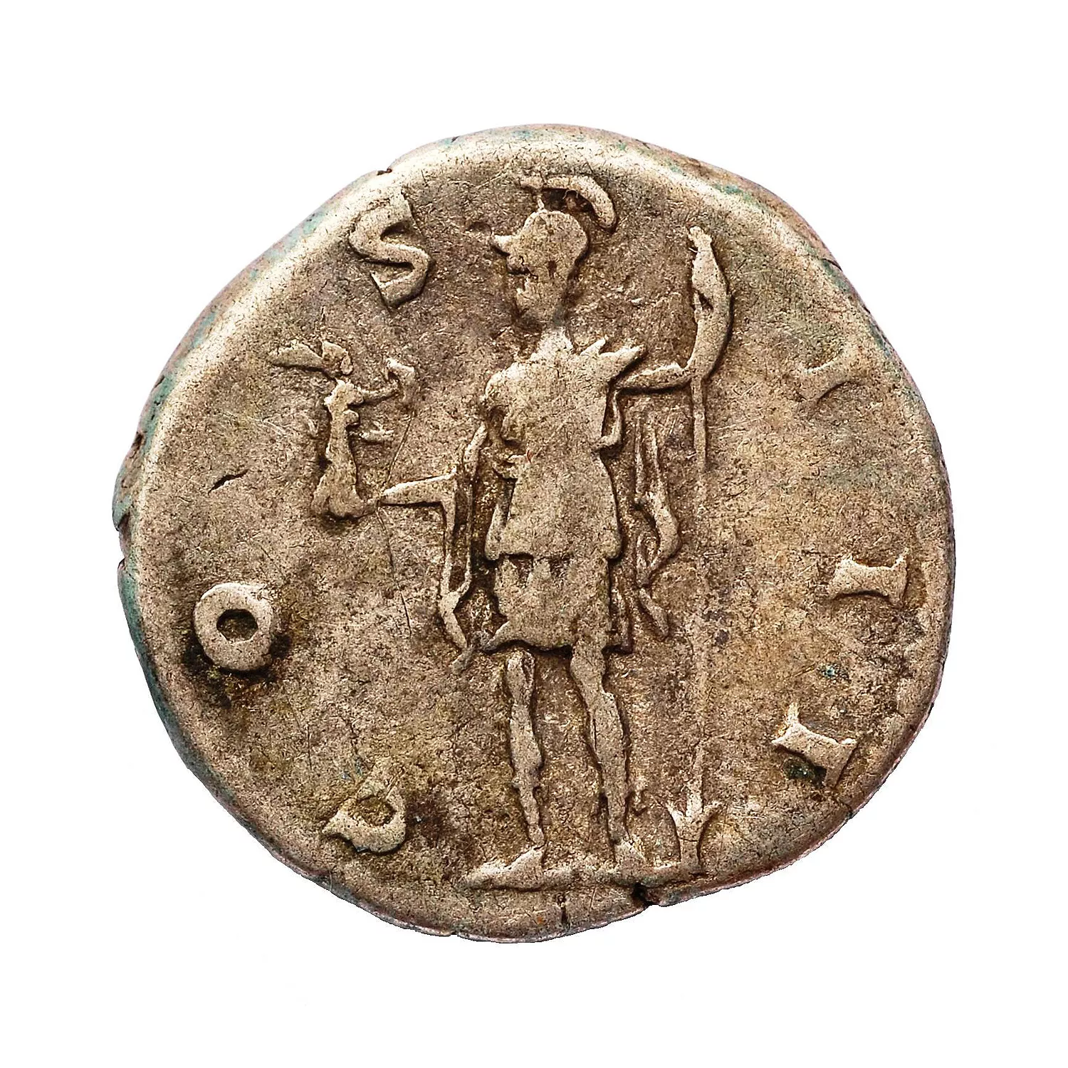 Roma debout à gauche, tenant une victoire et une lance renversée