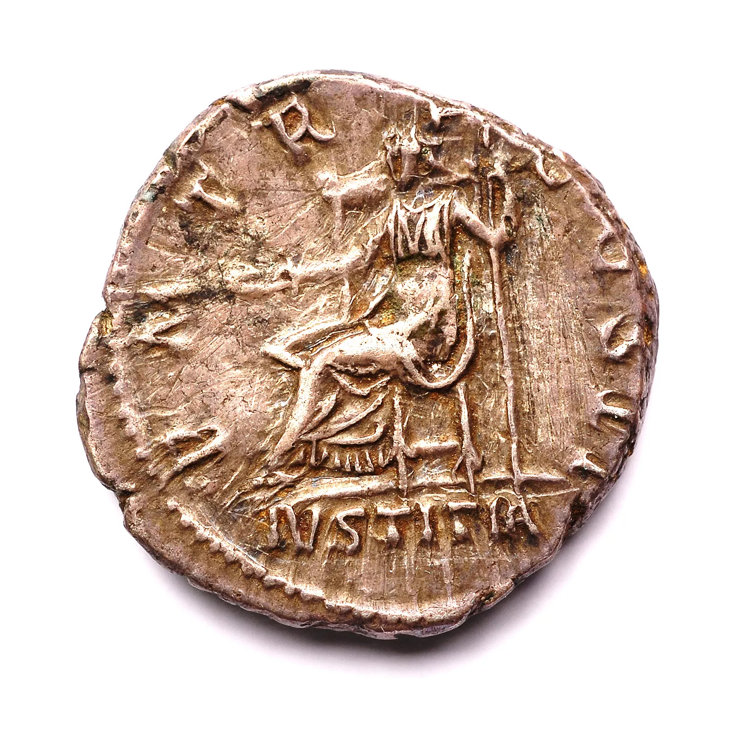 Iustitia assise à gauche, tenant une patère et un long sceptre droit