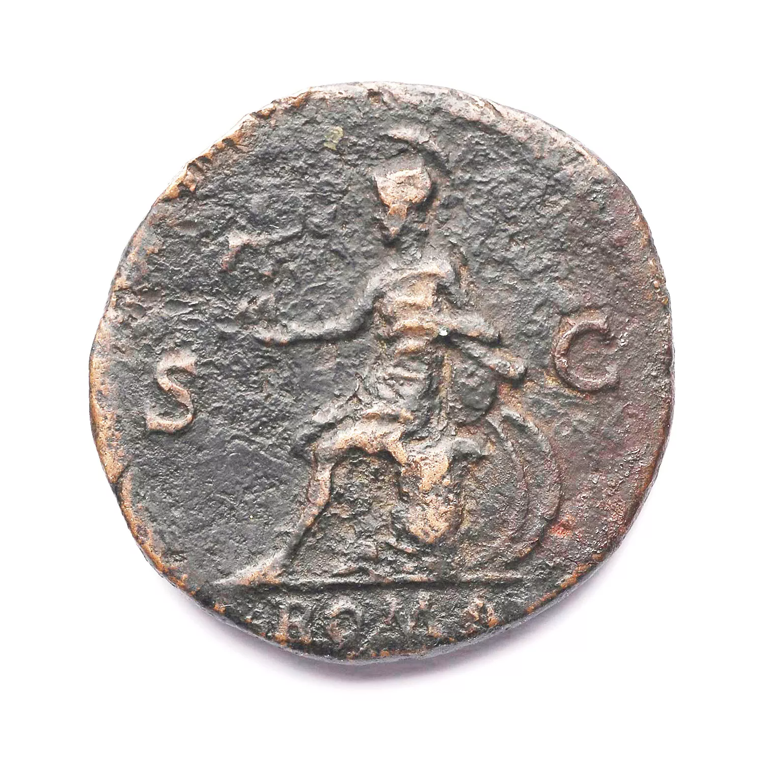 Roma assise à gauche sur une cuirasse, tenant une victoire et le parazonium ; derrière, deux boucliers