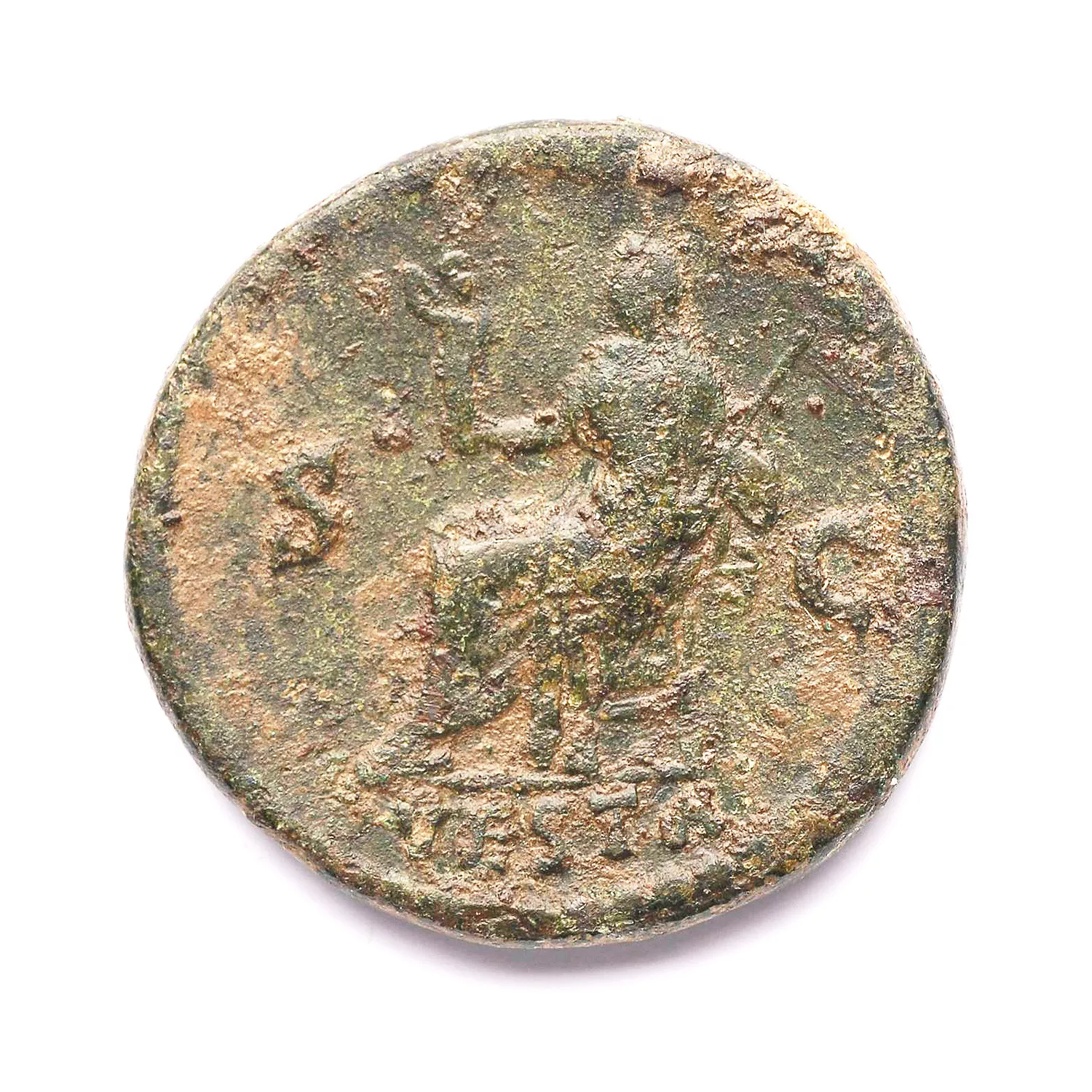 Vesta assise à gauche, tenant un sceptre et le palladium