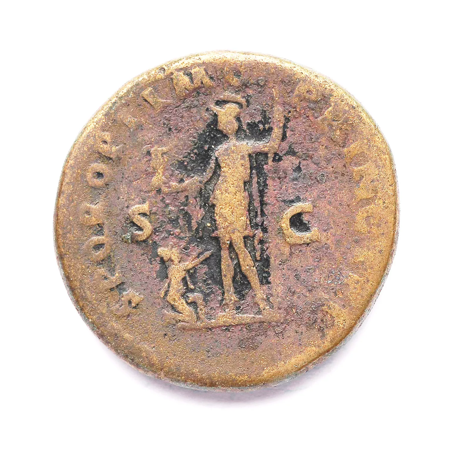 Rome debout à gauche, tenant une victoire et une lance ; à ses pieds, Dace agenouillé
