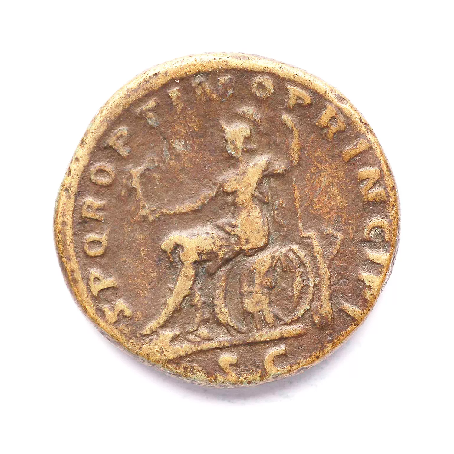 Rome assise à gauche sur une cuirasse, tenant une victoire et une lance ; derrière, armes