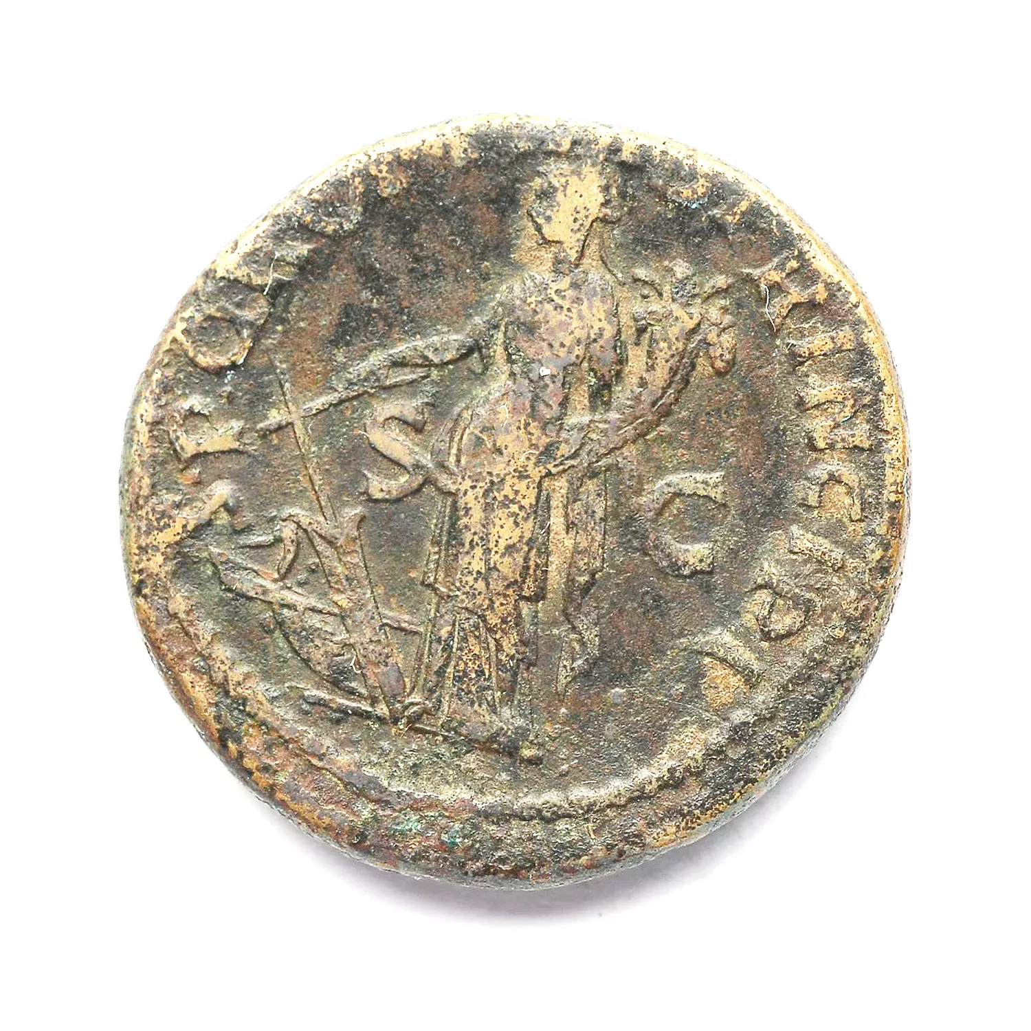 Fortuna debout à gauche, tenant un gouvernail sur une proue et une corne d'abondance