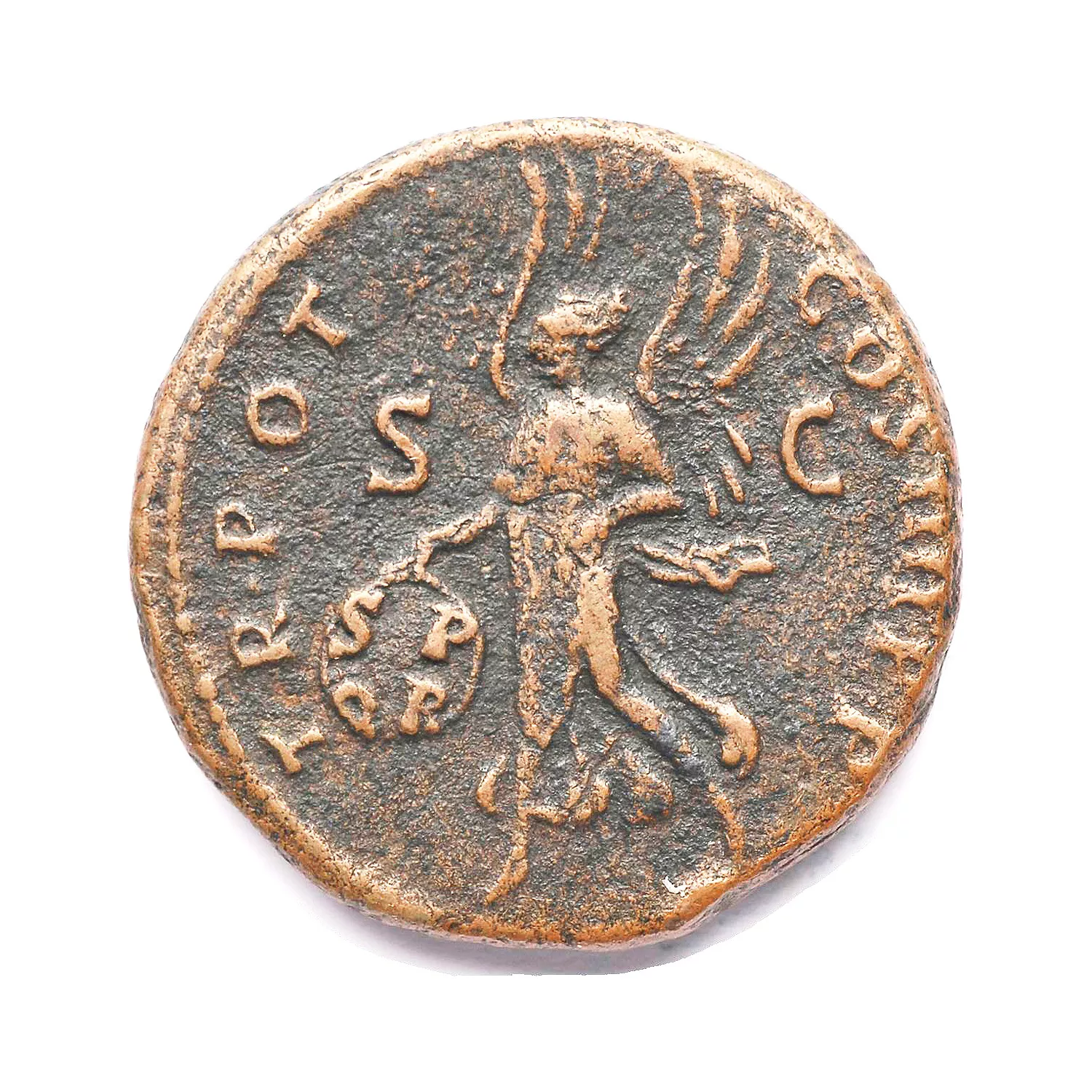 Victoire marchant à gauche, tenant une palme et un bouclier inscrit SP/QR