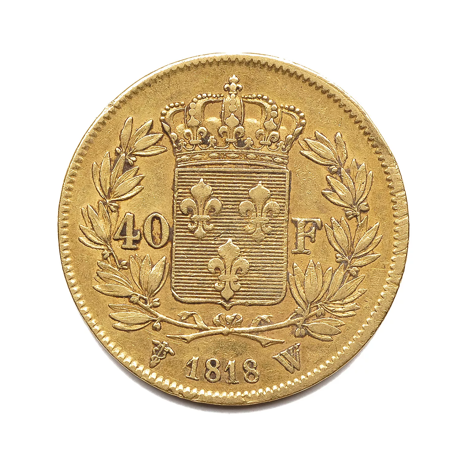 De part et d'autre d'un écu de France couronné entre deux branches de laurier, nouées à leur base, 1818 entre différent (caducée) et lettre d'atelier W le long du listel sous la couronne de laurier