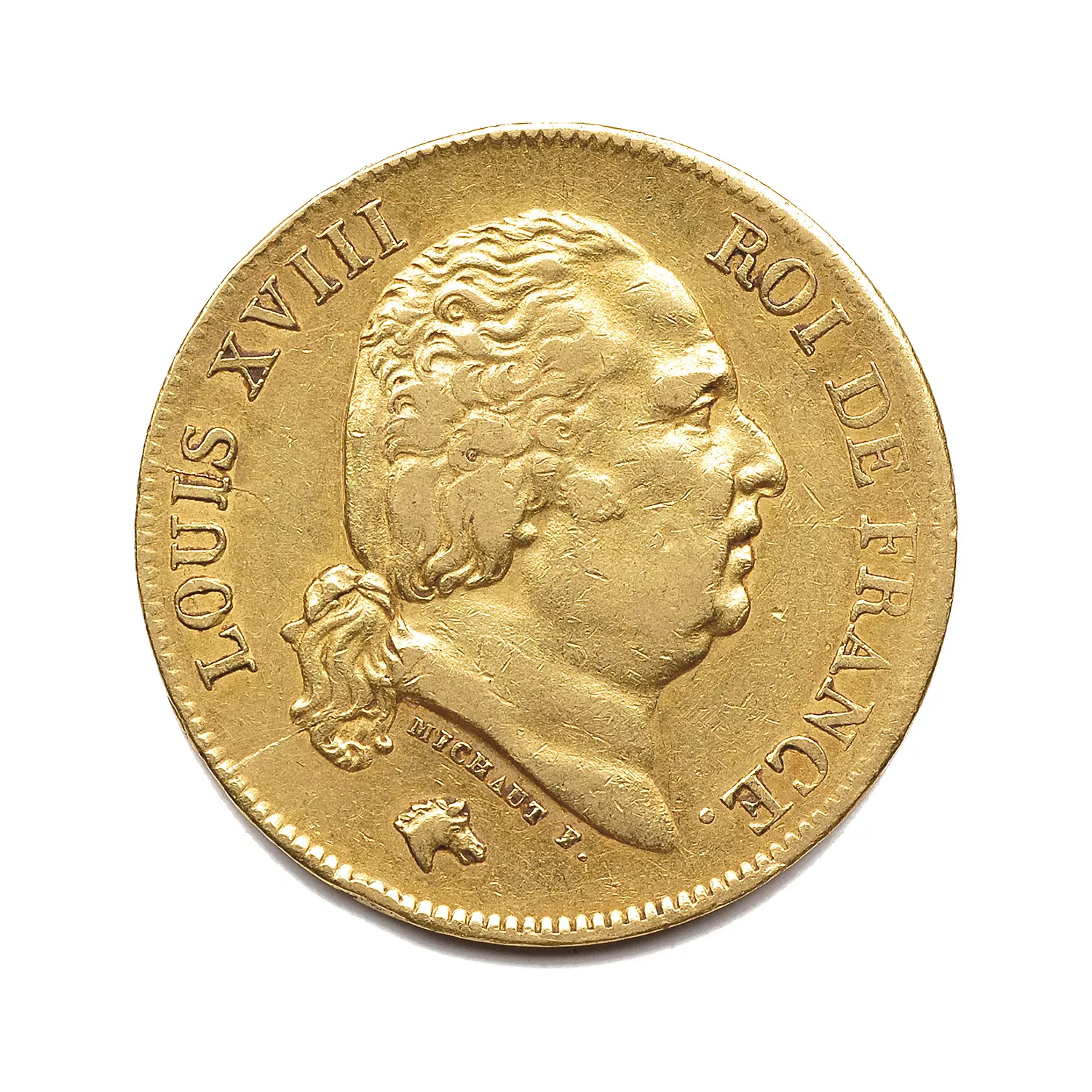 Tête nue de Louis XVIII à droite, les cheveux noués d'un ruban tombant derrière la tête ; au-dessous MICHAUT F. et tête de cheval