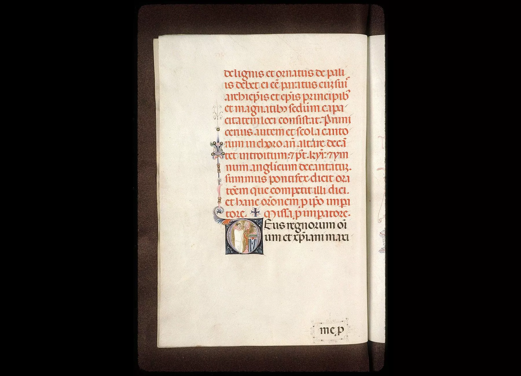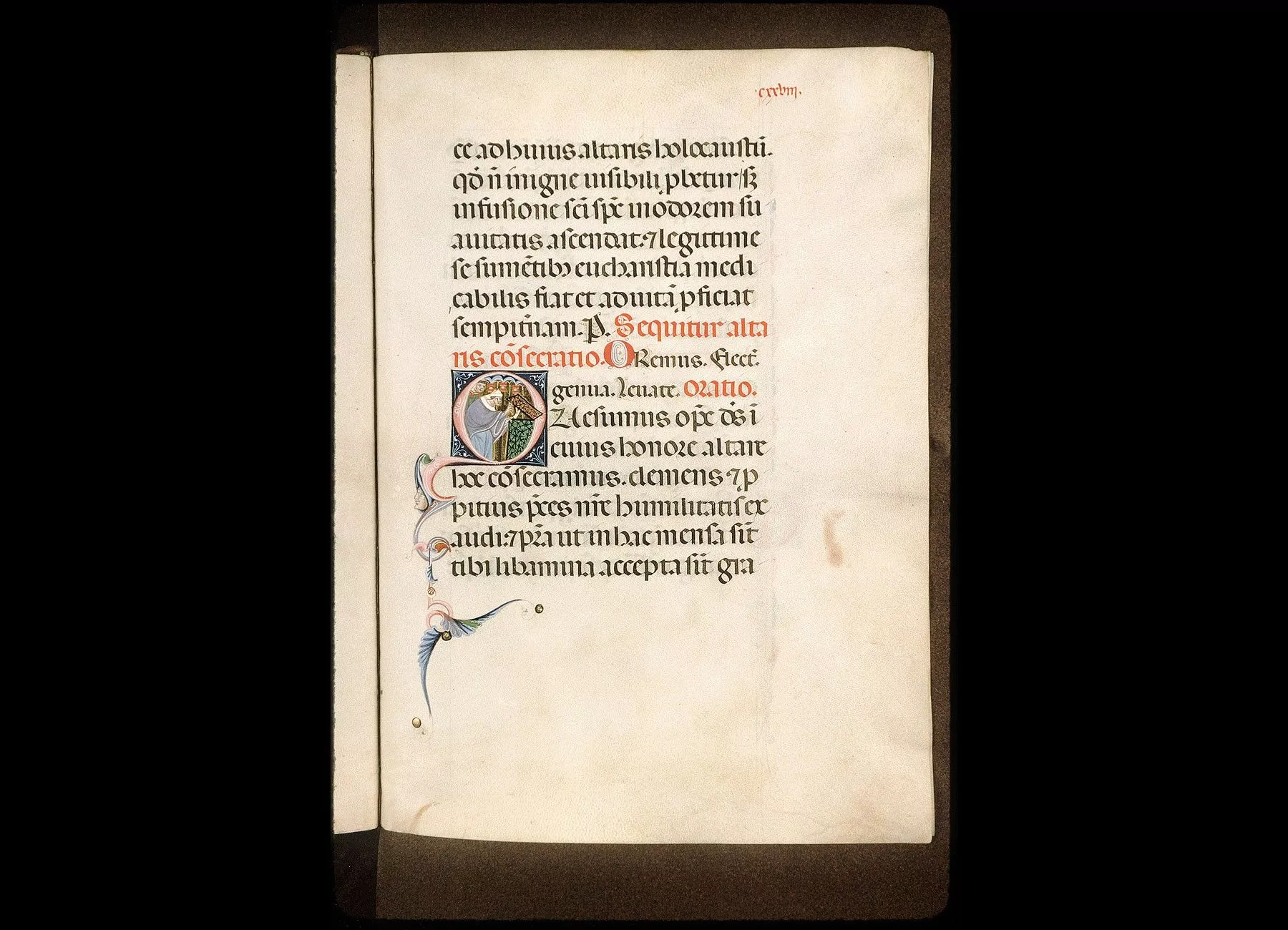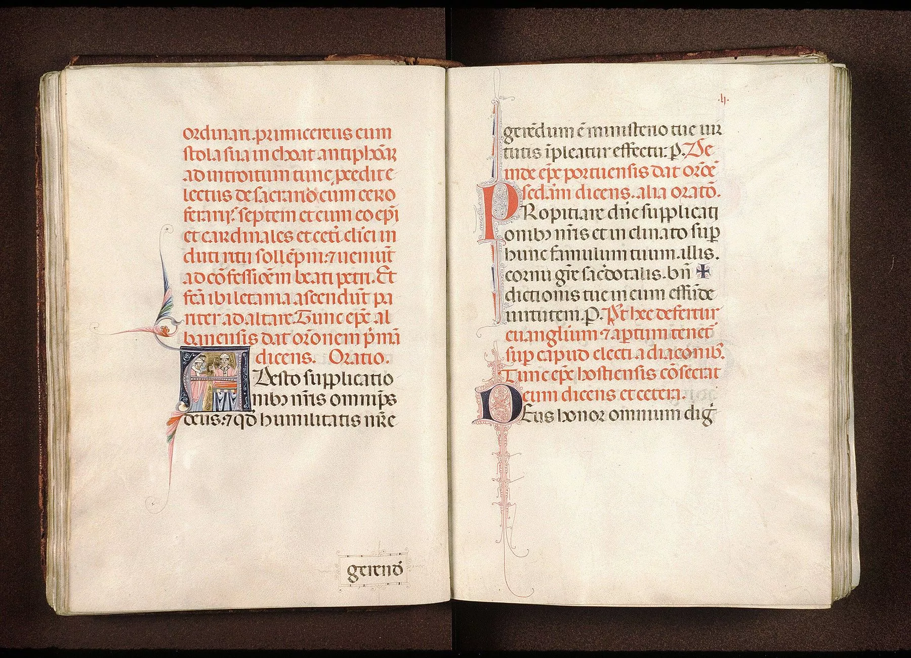 Commentaires de Labande. XIVe siècle. Vélin. 261 feuillets (manquent les fol. 55, 56, 200,204). 311 sur 239 millim. Les principales initiales en tête de l'Ordodes cérémonies sont miniaturées à la façon italienne; elles sont ornéesde personnages sur fond d'or et donnent la figuration des cérémonies ; les autres initiales, alternativement rouges et bleues, sont ornées de filigranesqui décorent la marge. Rel. bois, recouvert de basane, ornementsformés de petits médaillons, avec oiseaux et animaux. (Métropoled'Avignon.)