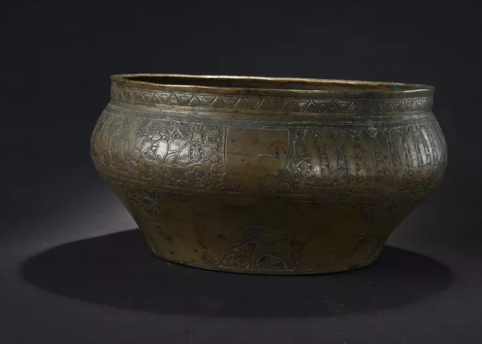 Alliage cuivreux, décor gravé, incrusté d'argent (à l'origine) et de pâte noire