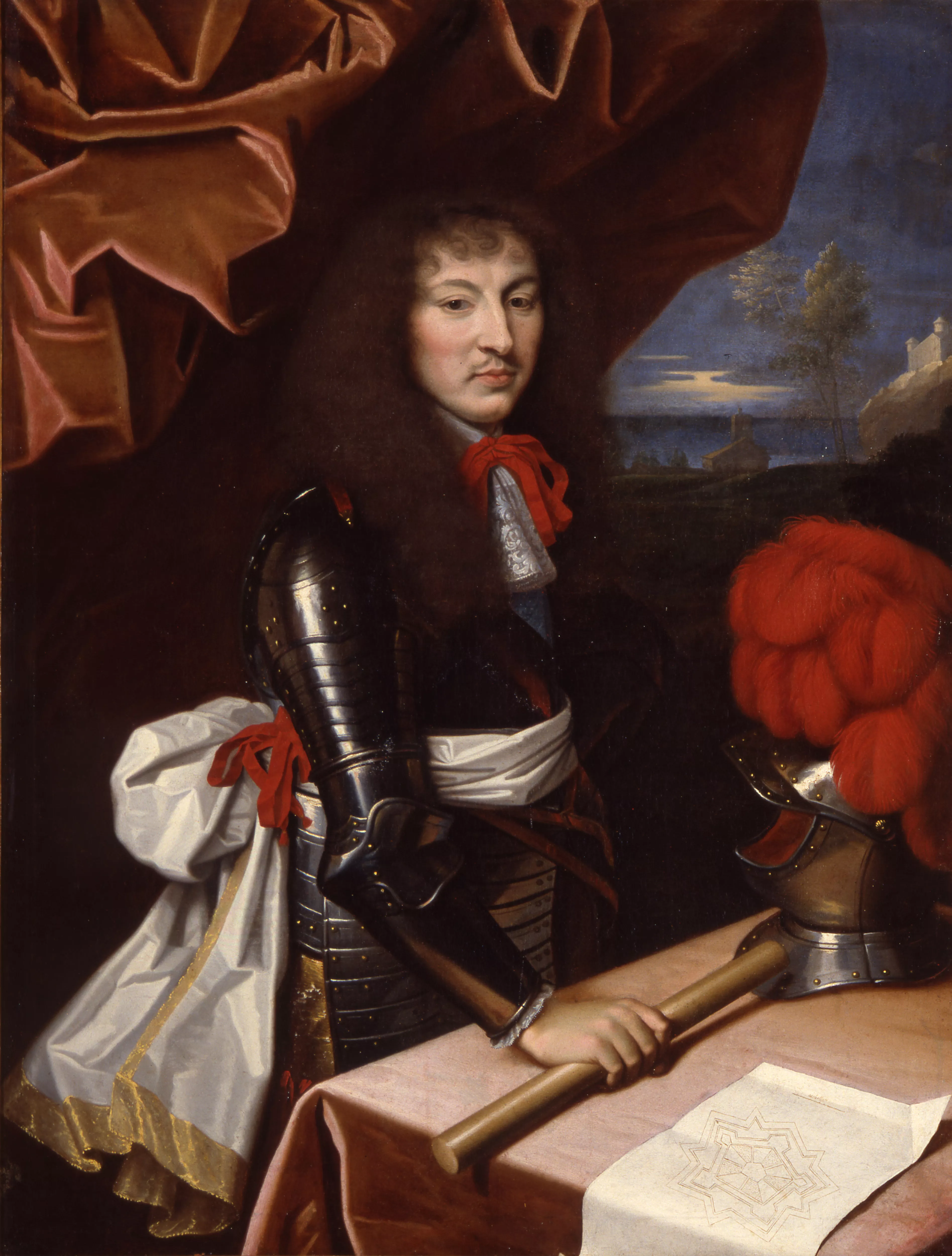 Louis XIV (1638-1715, régnant depuis l643) avait vingt quatre ans quand fut publiée l'estampe de Nicolas de Poilly reproduisant son portrait par Nicolas Mignard. La légende de la gravure, Ense Prius Martis, Themidis nunc ense (« Fort d'abord par le glaive de Mars et aujourd'hui par celui de Thémis ») a la valeur d'une promesse : celle de la réforme de l'État qui a débuté avec la disgrâce de Fouquet en l661, suivie de l'institution d'une chambre de justice chargée d'examiner et le cas échéant de punir les abus des financiers. C'est le début du règne personnel, après une longue période de guerres civiles (la Fronde, terminée depuis 1653) et extérieures (paix avec l'Espagne au traité des Pyrénées en l659). Nicolas Mignard eut l'occasion de se faire connaître de Louis XIV pendant son séjour à Avignon en 1660. À la fin de l'année il était appelé à Paris. Dès l'année sa suivante, il mentionne dans correspondance un portrait du roi qui a été vivement apprécié au point que celui-ci en demande déjà un autre et que quatre graveurs l'ont déjà reproduit : François et Nicolas de Poilly, Robert Nanteuil et Pieter van Schuppen. Il a été copié en émail par Jean Petitot et par de nombreux peintres en miniature (Marcel, 1931, et Boyer, 2000). Mignard lui-même dit en avoir fait des copies dont une à l'intention de son ami et client avignonnais, Pierre François de Tonduti de Avignon de Saint-Légier 1979. Il n'est guère possible de savoir à laquelle de ces versions correspond la peinture donnée par Marcel Puech. Le visage est exacternent le même que dans la gravure de Nicolas de Poilly, seulement tourné dans l'autre sens. En revanche le tableau représente Louis XIV dans un attirail guerrier, bâton de commandement à la main et un superbe casque à plumes rouges posé devant lui alors qu'il porte dans la gravure un manteau doublé d'hermine. Il est probable que la même tête ait été utilisée plusieurs fois et placée dans des contextes différents. La partie déconcertante du tableau d'Avignon, par ailleurs d'une très belle qualité dans I'exécution, est le paysage maritime de l'arrière-plan, d'autant plus qu'on n'y décèle aucune allusion guerrière. Il semble indéniable que la peinture est de la main de Nicolas Mignard mais, comme rien ne garantit qu'elle provienne d'une collection méridionale, il serait risqué d'y voir l'exemplaire autrefois envoyé à Pierre de Tonduti.