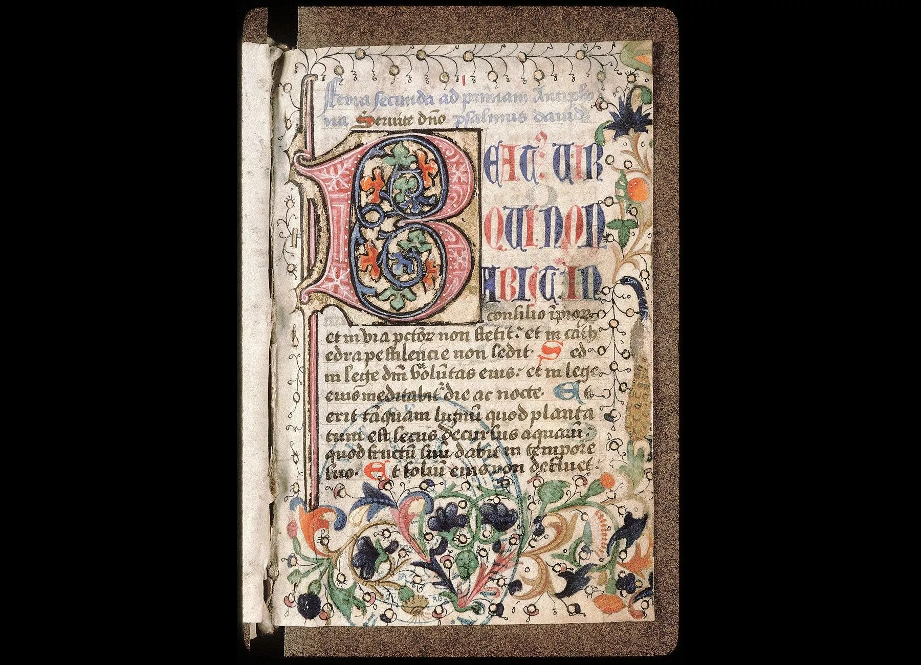 Fol. 1. " Feria secunda. Ad primam. Antiphona : Servite Deo. Psalmus David. Beatus vir qui non abiit... "