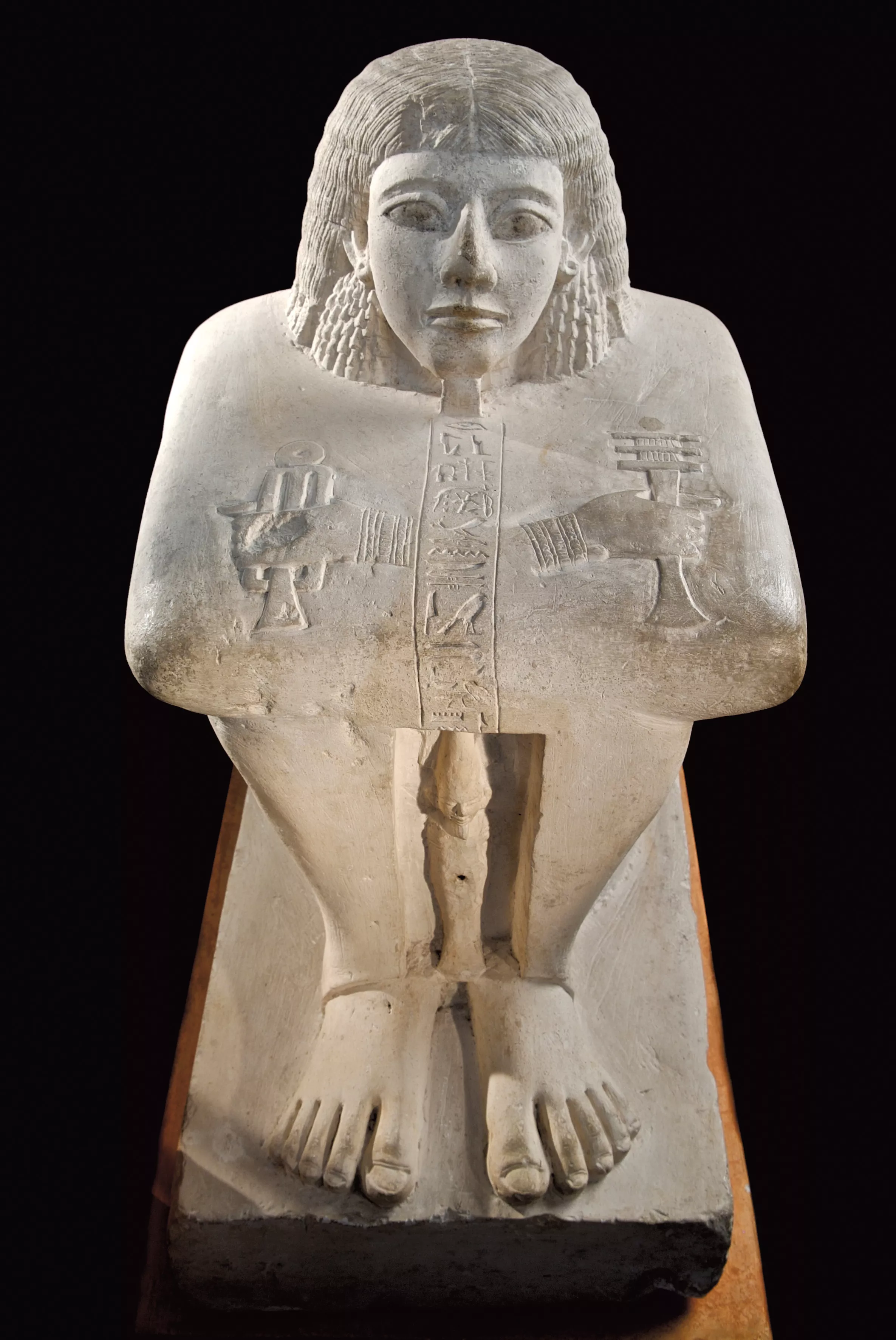 Cette statue exceptionnelle illustre un type peu attesté, combinant la tech- nique de la ronde bosse et celle d'une statue-bloc. Elle représente un homme assis, les bras croisés au des- sus des genoux, un haut dignitaire, <<< scribe royal, généralissime du Seigneur du Double Pays, Hori, défunt, fils de Bak-Amon [...]». Le défunt, enveloppé d'un manteau, est coiffé d'une perruque dite à revers. Entre ses jambes, surgit une statuette momiforme et primitivement ithyphallique (au phallus dressé), une effigie du dieu Osiris, coiffé de la couronne atef, couronne comportant à la base et au centre un disque solaire, souvent flanqué de deux cornes de bélier.