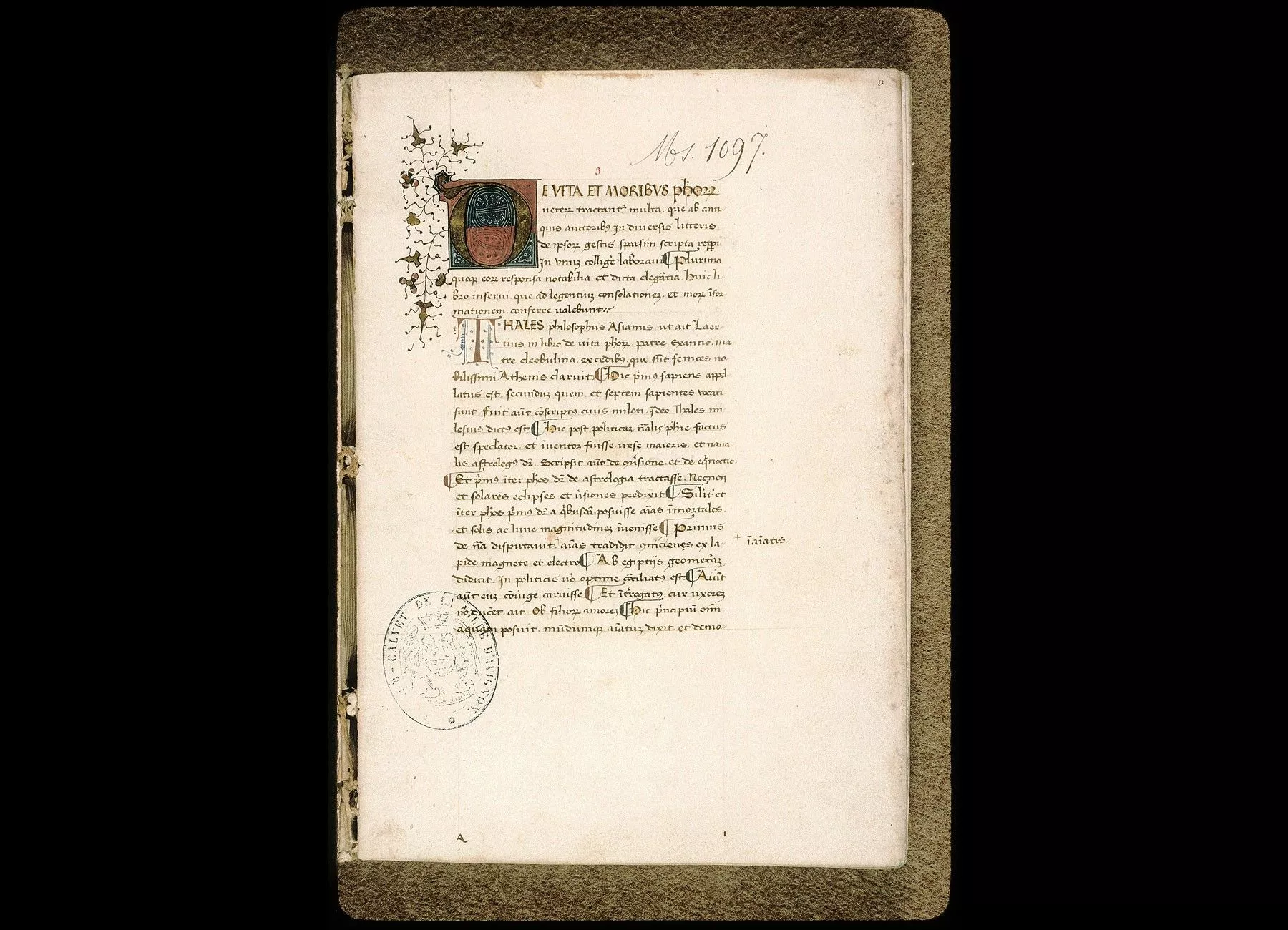 Fol. 3. Gautier Burley. De vita et moribus philosophorum et poetarum. " De vita et moribus philosophorum veterum tractantur multa... Thales, philosophus Asianus, ut ait Laertius... "
