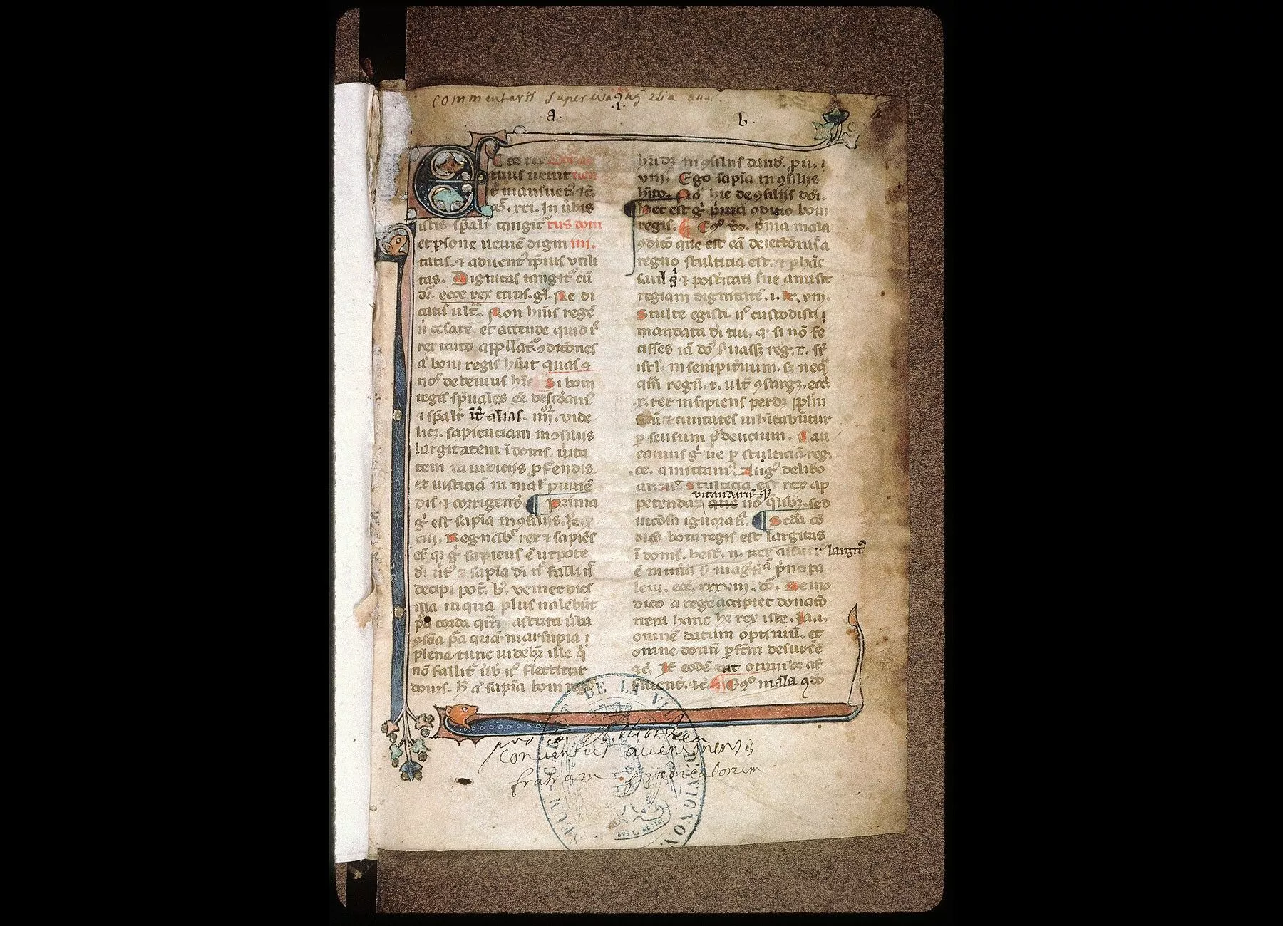 Commentaires de Labande. XIVe siècle. Parchemin. 239 feuillets à 2 col. 189 sur 128 millim. Première page encadrée avec les ornements de la lettre initiale.Rel. basane. (Frères Prêcheurs d'Avignon.)