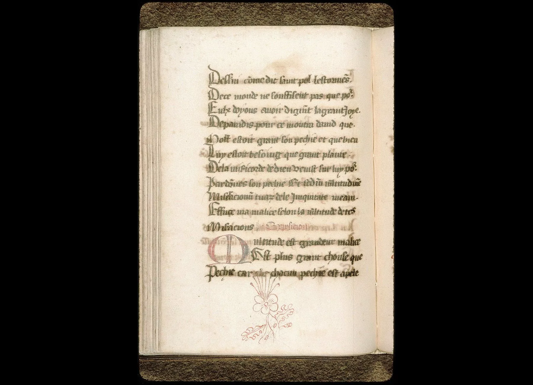 Fol. 37. " L'exposicion de Miserere mei, Deus, secundum magnam misericordiam tuam. " Prologue. " Il est recité ou livre des Roys que David envoya ses gens d'armes en ung pais loing, desqueulx gens d'armes Joab estoit seneschal... " Incipit de l'exposition (fol. 39 v°) : " Miserere mei, Deus... En sest istoire nous est montré comment nous devons fouir paresce... "