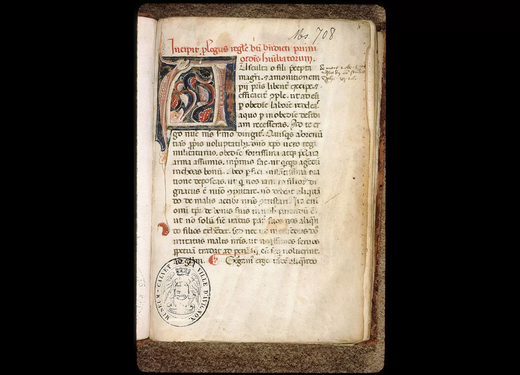 Fol. 1. " Incipit prologus regule beati Benedicti, primi ordinis humiliatorum. Ausculta, o fili... " Cette règle de St Benoît a été modifiée : au lieu d'être applicable à un monastère, elle a été arrangée pour un chapitre de chanoines - partout, au lieu demonasterium, a été mis le motcanonica. Aussi certains § de la véritable règle monastique de St Benoît ont été omis et remplacés par d'autres